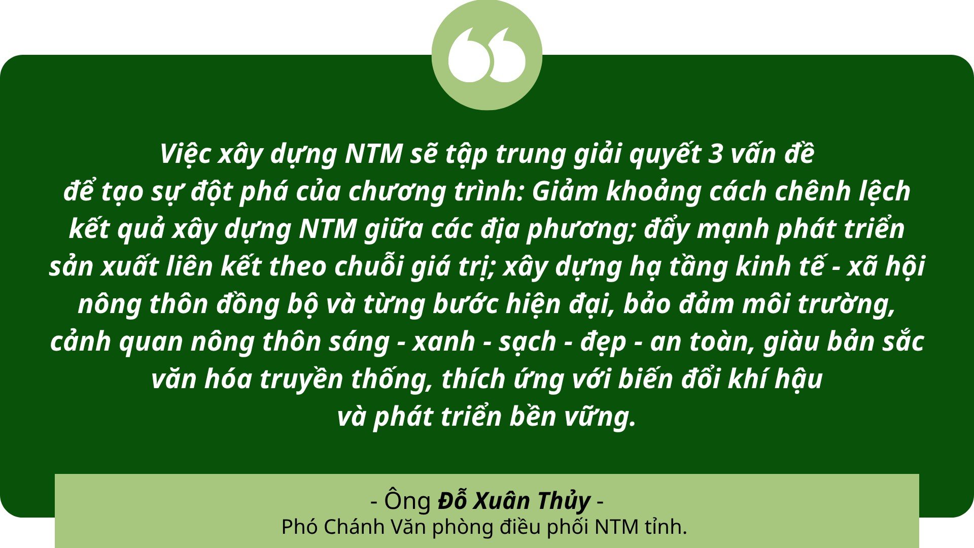 Potrivit domnului Do Xuan Thuy - șef adjunct al Biroului Provincial de Coordonare a Noilor Zone Rurale, Programul de Construcție a Noilor Zone Rurale pentru perioada 2026 - 2030 trebuie să „asigure substanță, profunzime, eficiență, în beneficiul oamenilor”, vizând construirea unei dezvoltări rurale durabile și asociată cu procesul de urbanizare.