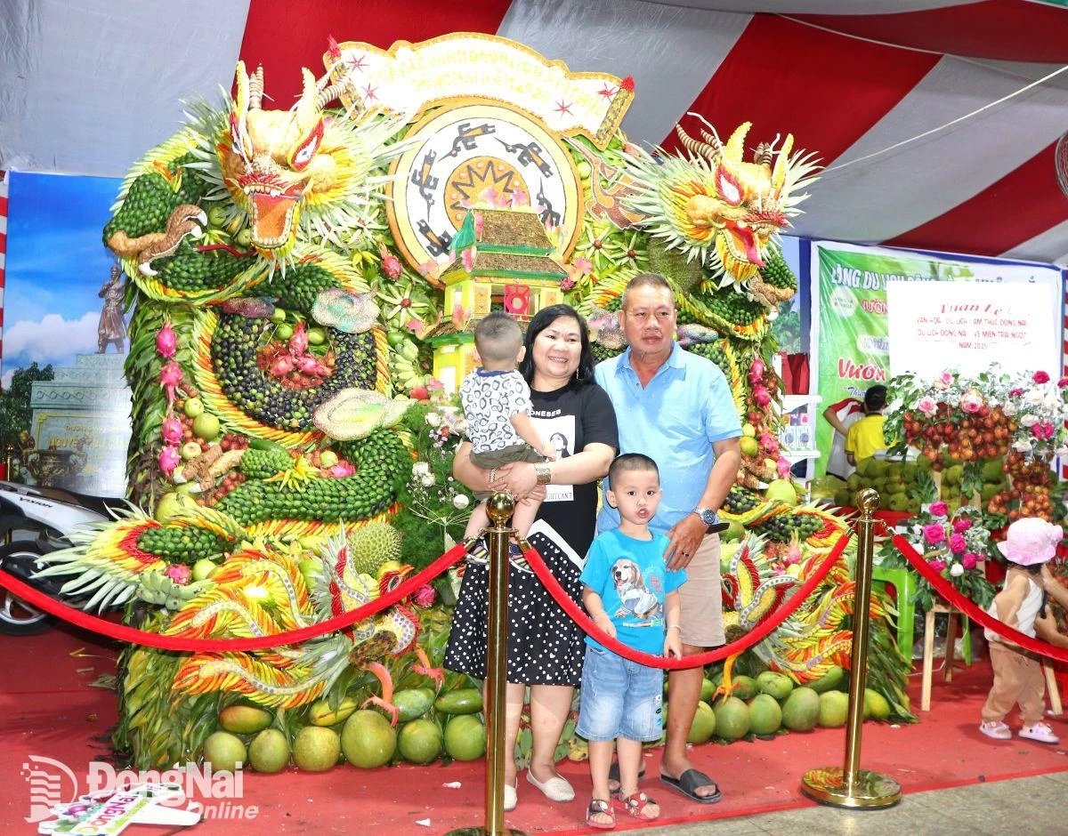 | Туристы посещают и фотографируются на память рядом с моделью Храма литературы Тран Бьен, сделанной из фруктов. Фото: Нгок Лиен. |
