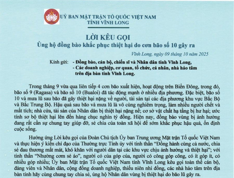 Источником финансирования является Провинциальный фонд мобилизации помощи, что обеспечивает гласность, прозрачность, объективность и соответствует духу призыва Президиума Центрального Комитета Вьетнамского Отечественного Фронта, политике Провинциального комитета партии и Постановлению № 93 правительства о мобилизации, получении, распределении и использовании добровольных пожертвований для содействия преодолению трудностей, вызванных стихийными бедствиями, эпидемиями, инцидентами, а также поддержке пациентов с тяжелыми заболеваниями.