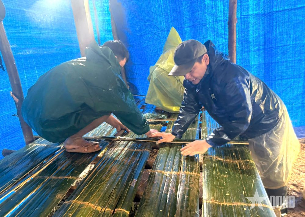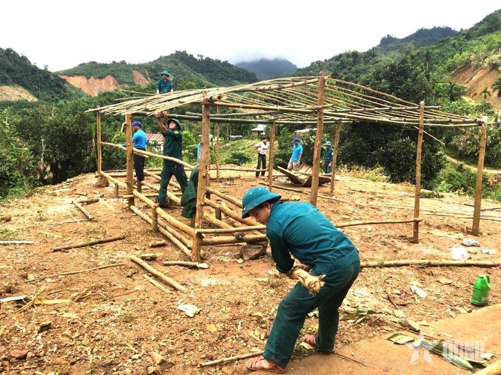 Уже почти неделю, помимо преодоления оползней и пересечения гор и лесов, чтобы поставлять продовольствие в изолированные районы, солдаты также используют свое время, чтобы отправиться в деревни, чтобы провести разведку и найти места для строительства соломенных домов и временных домов для людей. Некоторые рубили бамбук и строили столбы; некоторые накрывали и забивали гвоздями; некоторые прикрепляли заборы и строили экраны, от деревень 2, 3, 4 (коммуна Тра Ленг) до деревень Нгок Жяк, Тра Жяк, Нгок Ту, Сонг И (коммуна Тра Тан)... солдаты, ополченцы и другие силы работали очень срочно. Сильный дождь, сильный ветер и крутые, извилистые, скользкие, грязевые перевалы делали это недоступным для автомобилей, поэтому солдатам приходилось перевозить материалы и выполнять строительство полностью вручную. Работая днем и ночью, силы уже завершили 46 соломенных домов, бамбука и тростника, помогая людям обрести стабильную жизнь на первых порах.
