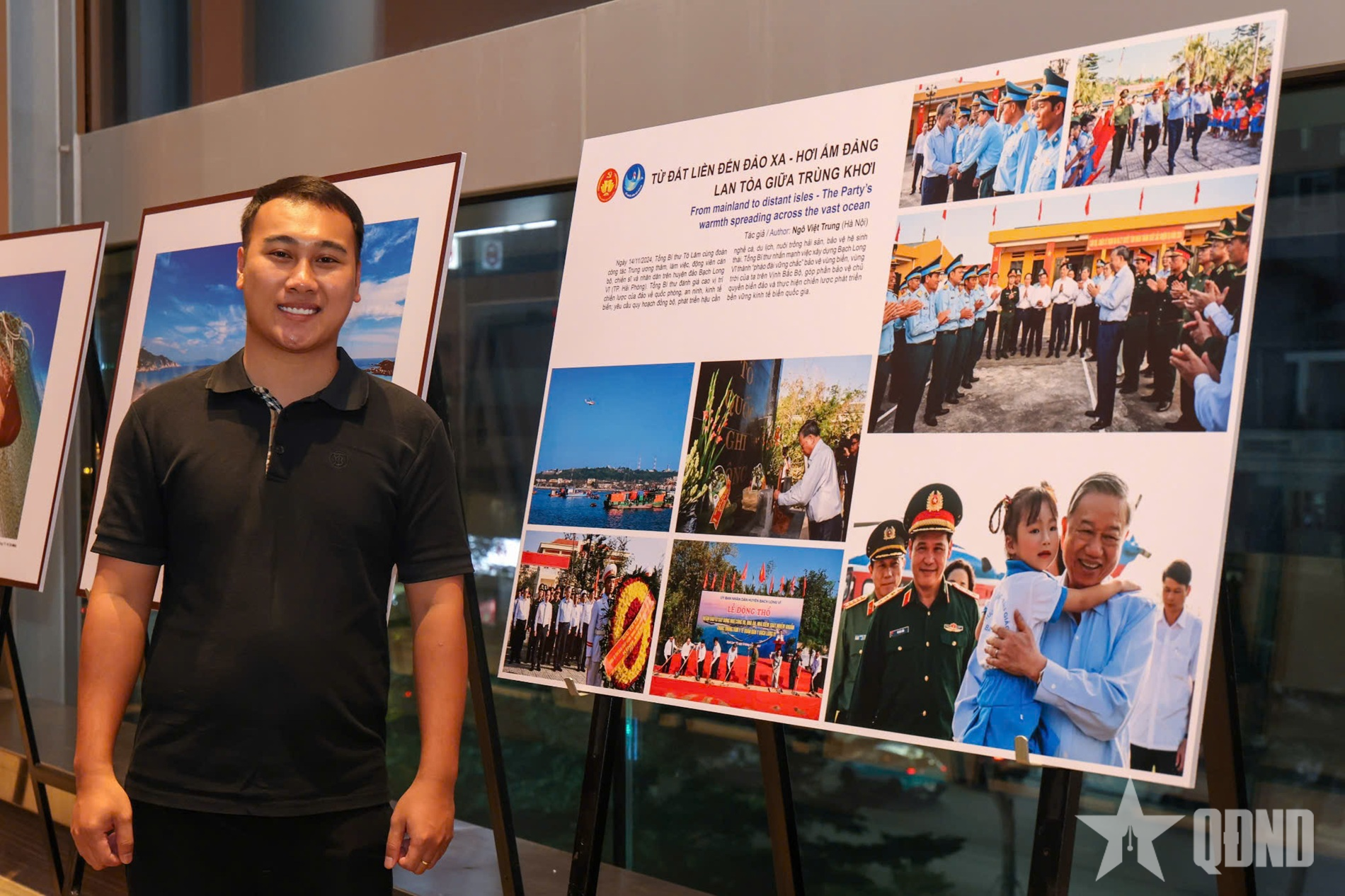 Автор, старший лейтенант Нго Вьет Чунг (отдел фотографии газеты «Народная армия») со своей работой «От материка до отдаленных островов — Тепло партии распространяется через океан», представленной на выставке. |