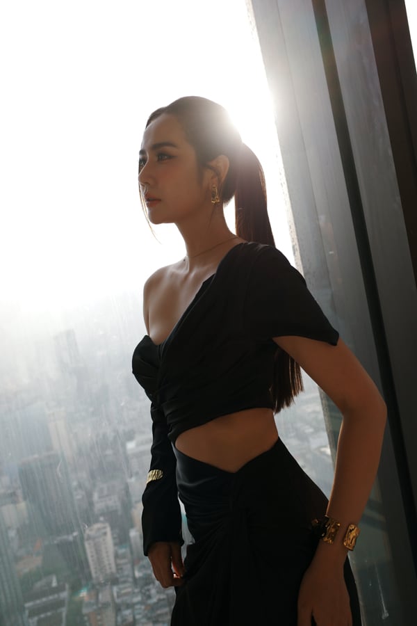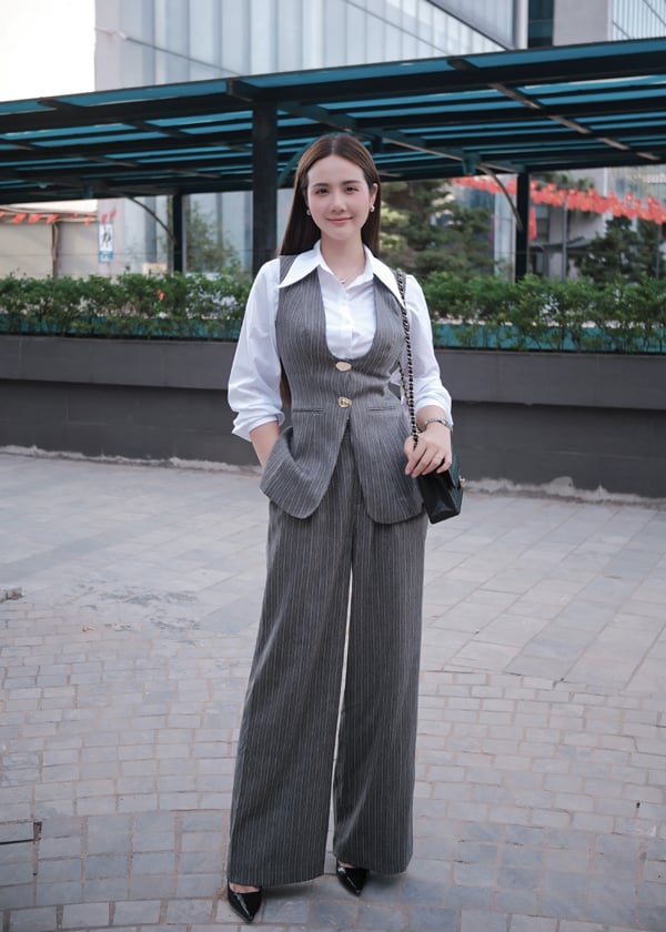 Мерцающий шёлковый материал помогает наряду не только подчеркнуть обворожительную красоту актрисы, но и создать эффектный образ. Изящные вырезы искусно подчеркивают её гладкую спину, хрупкие плечи и тонкую талию. В этом наряде Фан Минь Хуен прекрасна до последней сантиметра, ещё больше заслуживая звания «самой стильной актрисы на телеэкране», которое так полюбилось зрителям.