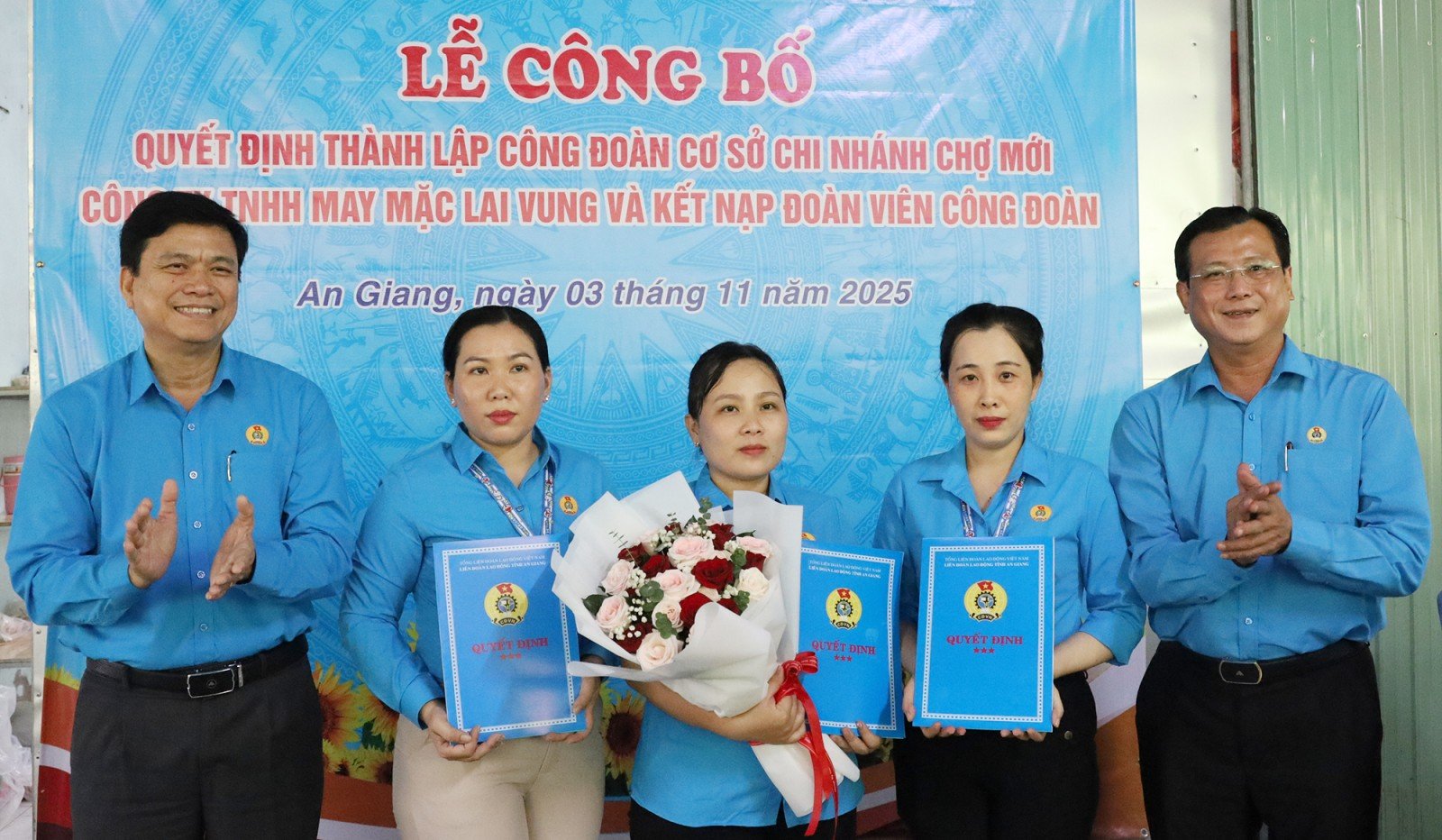 В тот же день в филиале компании Lai Vung Garment Company Limited в городе Чо Мой, коммуна Хойан, Федерация труда провинции Анзянг провела церемонию, на которой было объявлено о решении принять 102 работника филиала компании Lai Vung Garment Company Limited в Чо Мой во Вьетнамский профсоюз с 14 октября 2025 года.