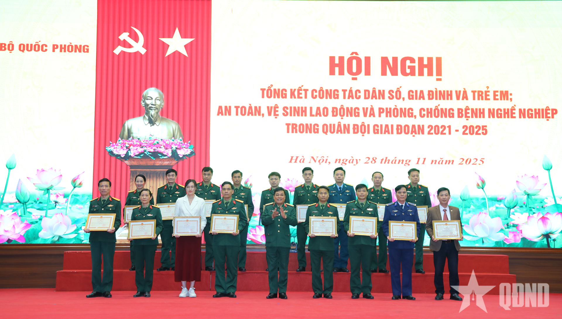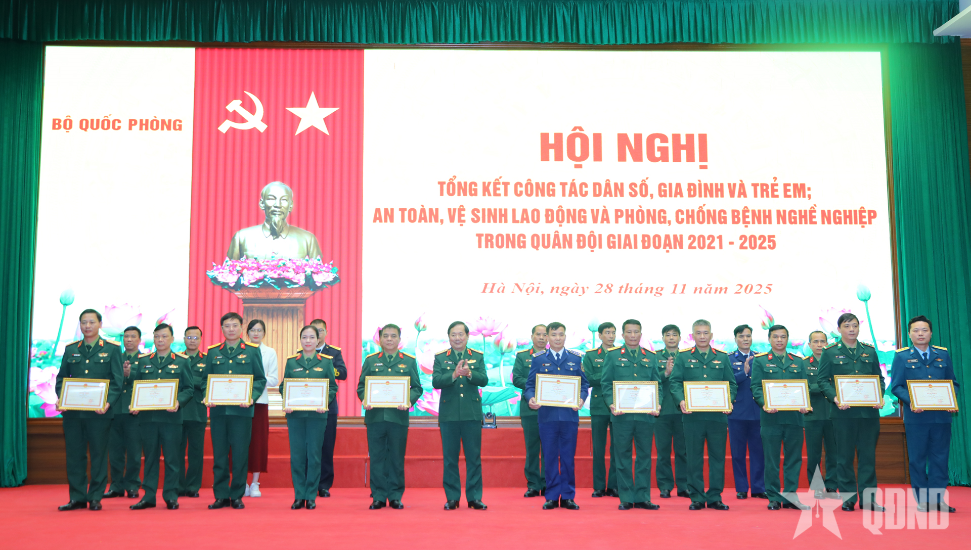 | Старший генерал-лейтенант Ле Хюй Винь вручил Почетные грамоты Министра национальной обороны коллективам, добившимся выдающихся успехов в организации и проведении работы в сфере народонаселения, семьи и детей, охраны труда и гигиены, профилактики профессиональных заболеваний за период 2021–2025 гг. |