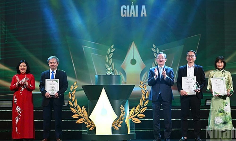 Товарищи Буй Тхи Минь Хоай и Лыонг Куок Доан (первый и третий слева) вручили премию А за достижения в области журналистики и премию А за достижения в литературном конкурсе выдающимся авторам и представителям авторских коллективов. |
