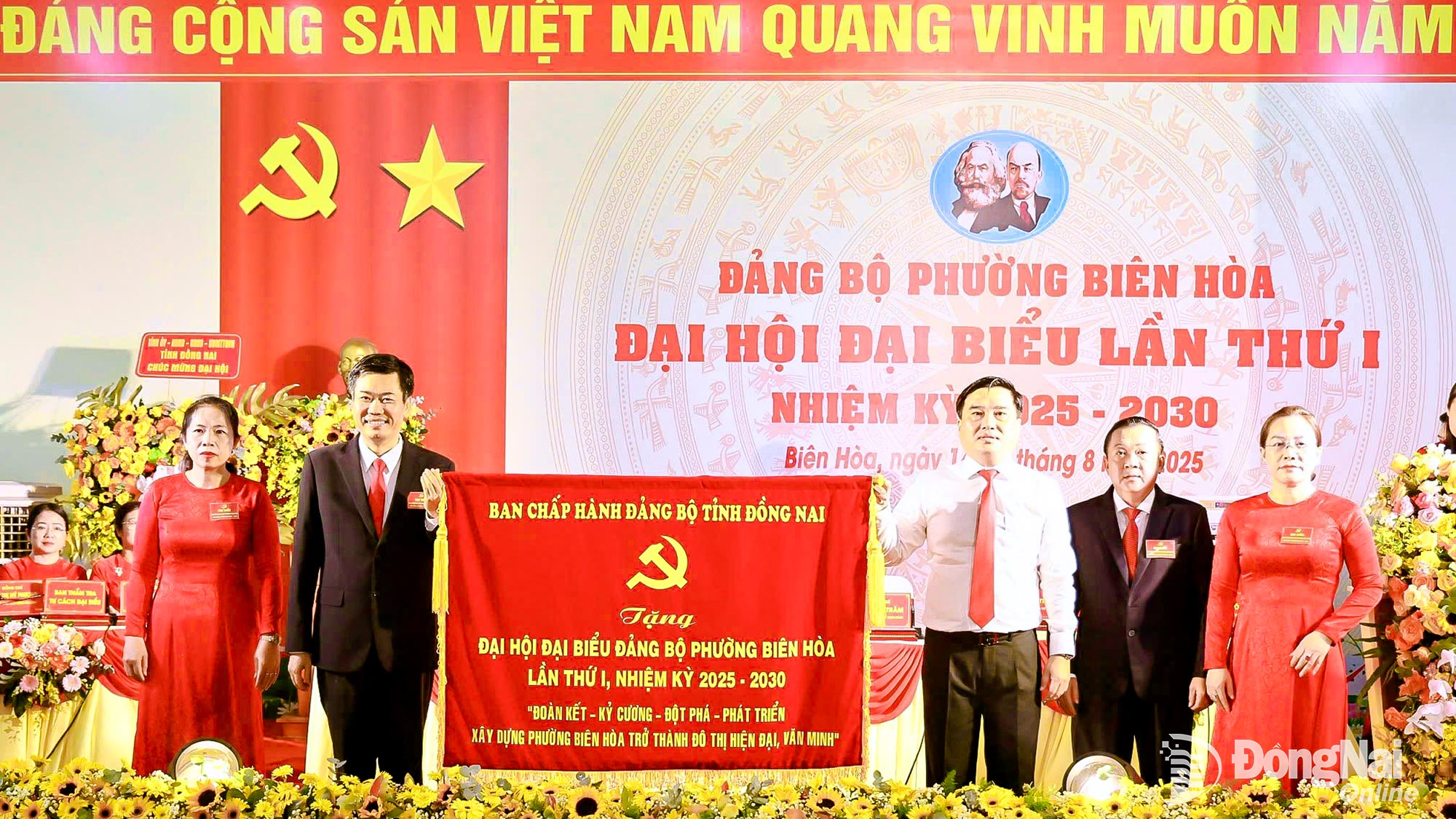 Товарищ Хо Ван Нам, член Постоянного комитета партии провинции, секретарь партии, председатель Народного совета округа Транбьен, вручил знамя Исполнительного комитета партии провинции 1-му съезду партии округа Бьенхоа на 2025-2030 гг. |