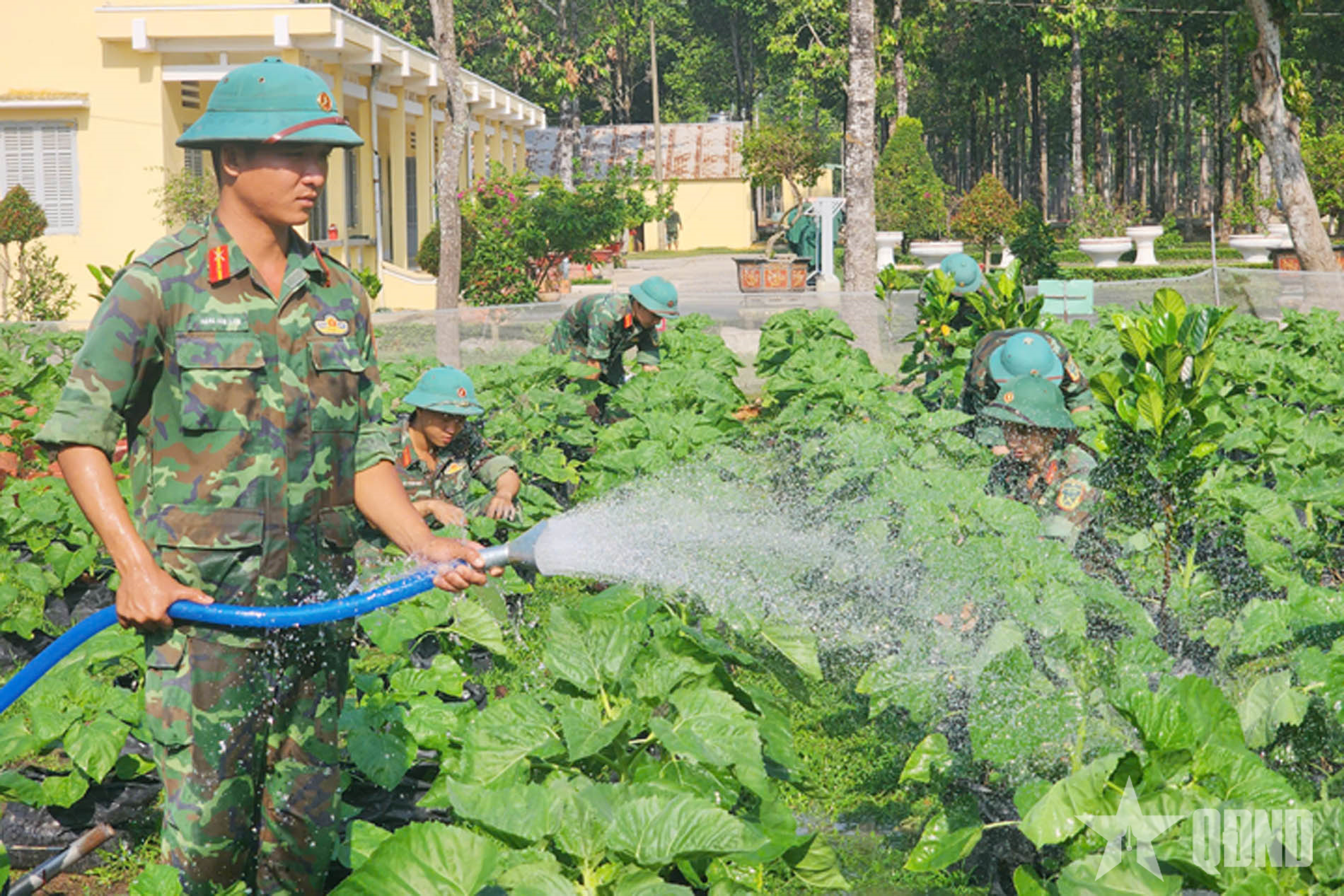 | Cán bộ, chiến sĩ Đại đội 7, Tiểu đoàn 5, Trung đoàn 2 (Sư đoàn 9) tranh thủ chăm sóc vườn hoa trong ngày nghỉ. |