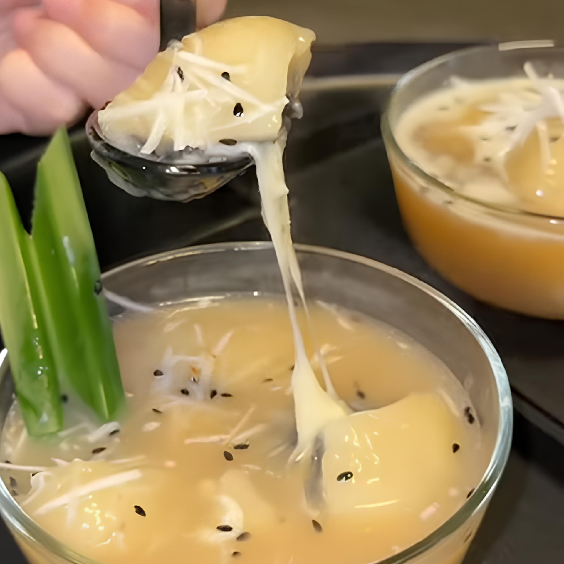 Förutom den traditionella smaken förnyas denna välbekanta rätt med en ostfyllning. De sega, klibbiga risbollarna omfamnar den doftande fyllningen med svart sesam och riven kokos, med mjuk, smält ost i mitten. När den hälls med varmt ingefäravatten och sedan kokosmjölk blir den övergripande smaken söt, kryddig, varm och måttligt fet.