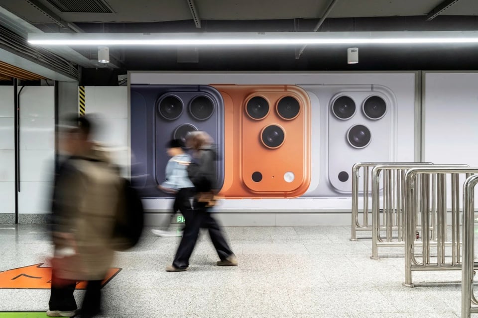 Reklam för iPhone 17 Pro på en tågstation i Shanghai (Kina). Foto: Bloomberg .  |