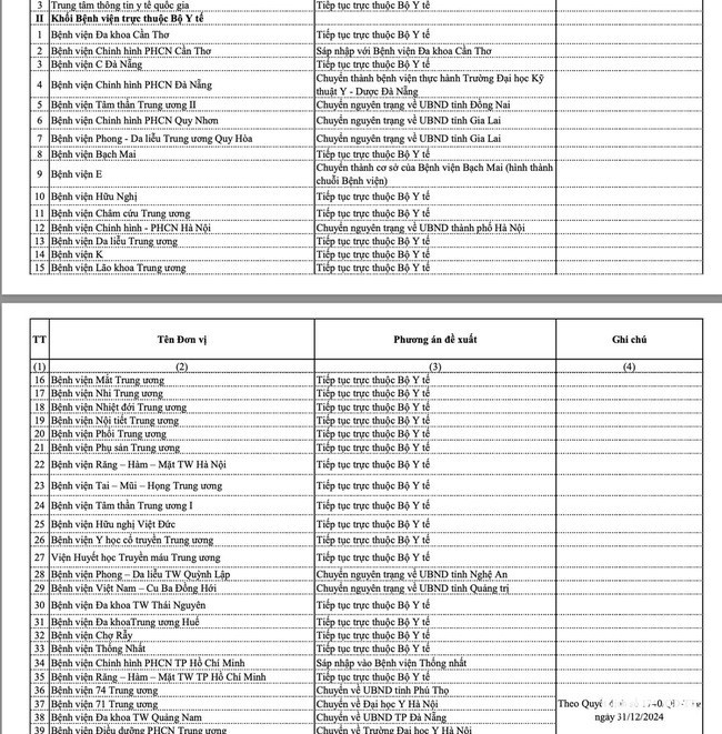 Många specialiserade sjukhus föreslås överlämnas till orter i sitt ursprungliga skick för att decentralisera förvaltningen och driften av anläggningarna. Dessa inkluderar Central Psychiatric Hospital II (överfört till Folkkommittén i Dong Nai-provinsen), Quy Hoa Central Dermatology and Leprasy Hospital (överfört till Gia Lai-provinsen), Central Hospital 74 (överfört till Phu Tho-provinsen) och Quang Nam Central General Hospital (överfört till Da Nang stad).