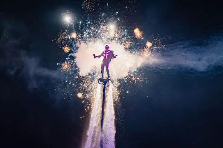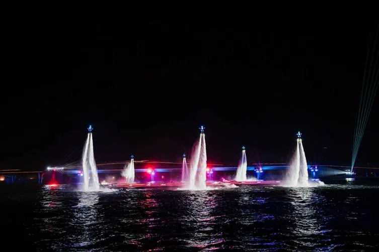 Sex vattenskoteråkare tränade med höghastighets "vågklyvning" och extremt skarpa svängar, vilket lämnade många människor som tittade på träningspasset i vördnad. Flyboard-"stjärnorna" utförde många akrobatiska stunts på 15 meters höjd med LED-kostymer och flares, vilket skapade "levande filmiska bilder" mitt på natthimlen.