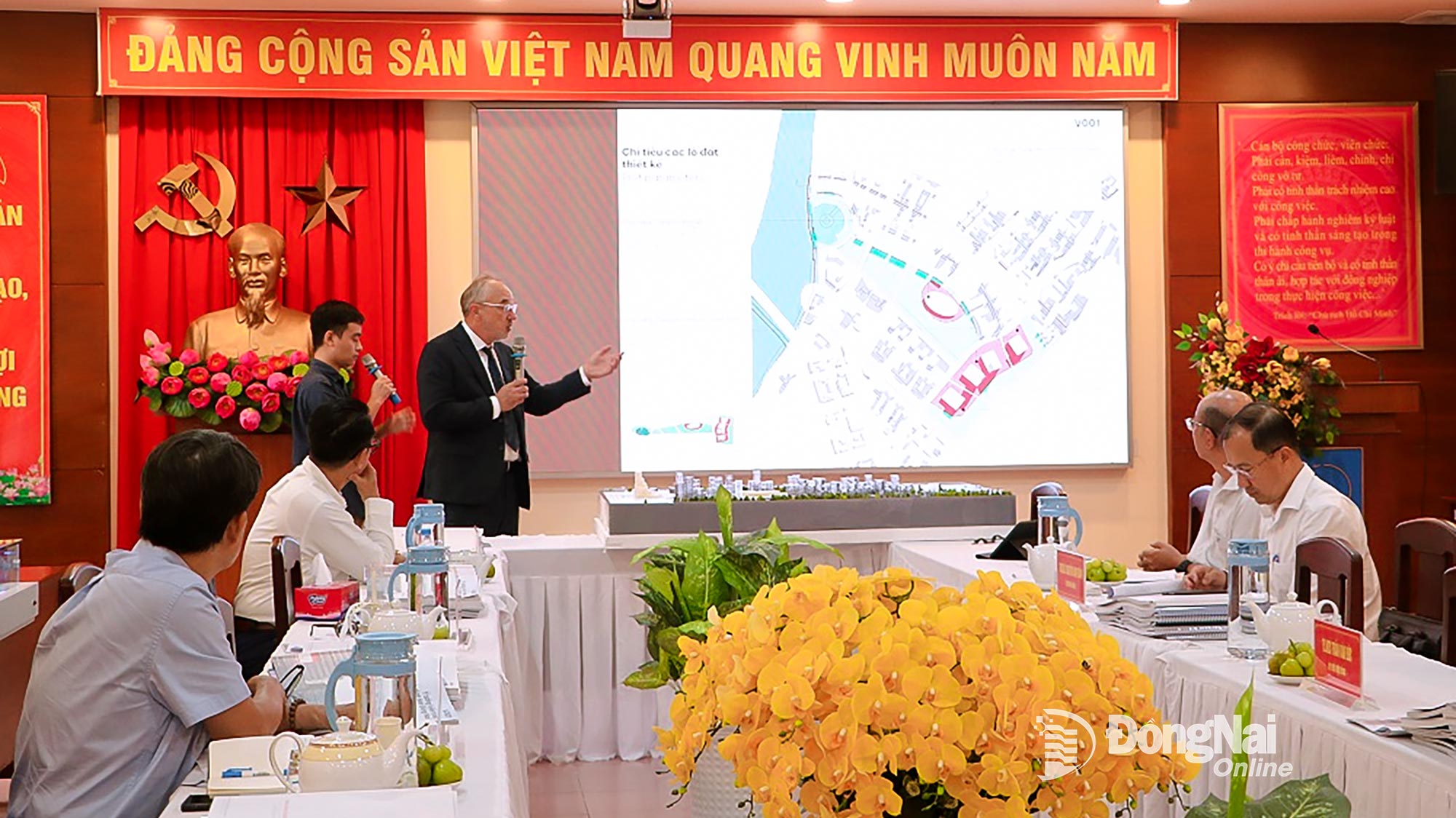 | En representant för en konsultenhet presenterar arkitekttävlingen för Dong Nai-provinsens politiska och administrativa centrum. Foto: Pham Tung |
