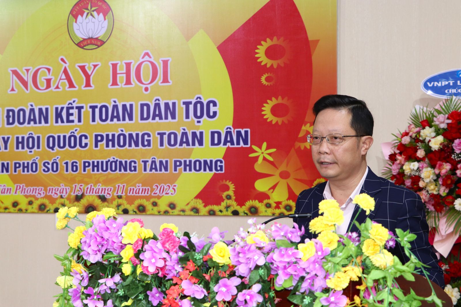 Kamrat Nguyen Ngoc Vinh - medlem av provinspartiets ständiga kommitté och ordförande för provinspartiets inspektionskommitté - uttryckte i ett tal vid festivalen sin glädje över att under det senaste året, under ledning och ledning av Tan Phong-distriktets partikommitté, particellen, frontarbetskommittén, massorganisationerna och invånarna i bostadsgrupp nr 16 har gått samman, väl implementerat partiets riktlinjer, politik och lagar i staten och uppnått många anmärkningsvärda resultat.