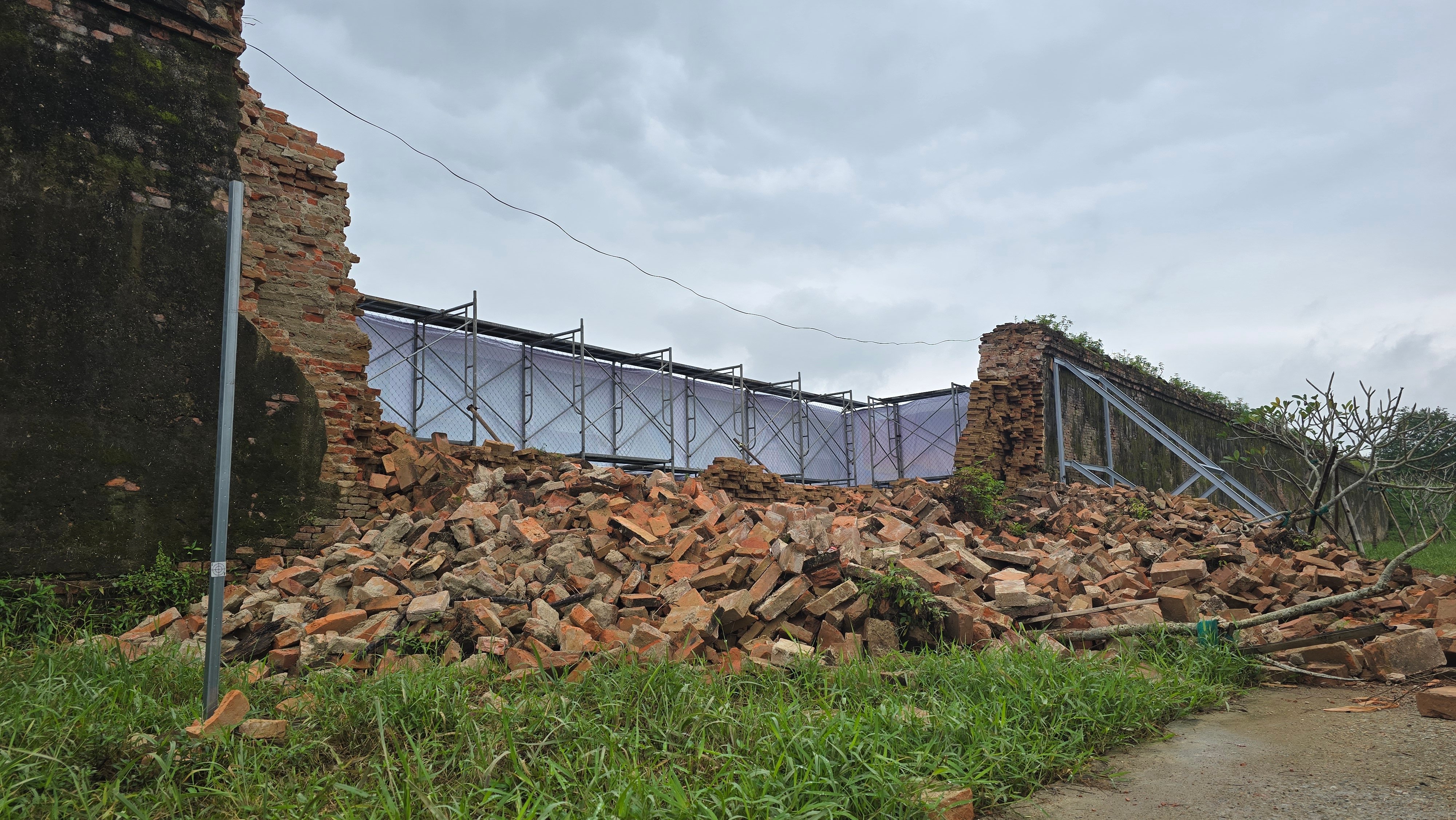 De kraftiga regnen i slutet av oktober och början av november 2025, som varade i många dagar, i kombination med den stigande vattennivån i Huongfloden som orsakade omfattande översvämningar, hade en stark inverkan på mursystemet. Regnvatten som sipprade in med tiden eroderade murens bas, i kombination med det ständigt föränderliga vattentrycket, vilket försvagade den traditionella tegelstrukturen.