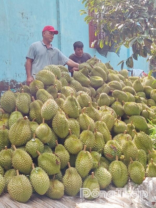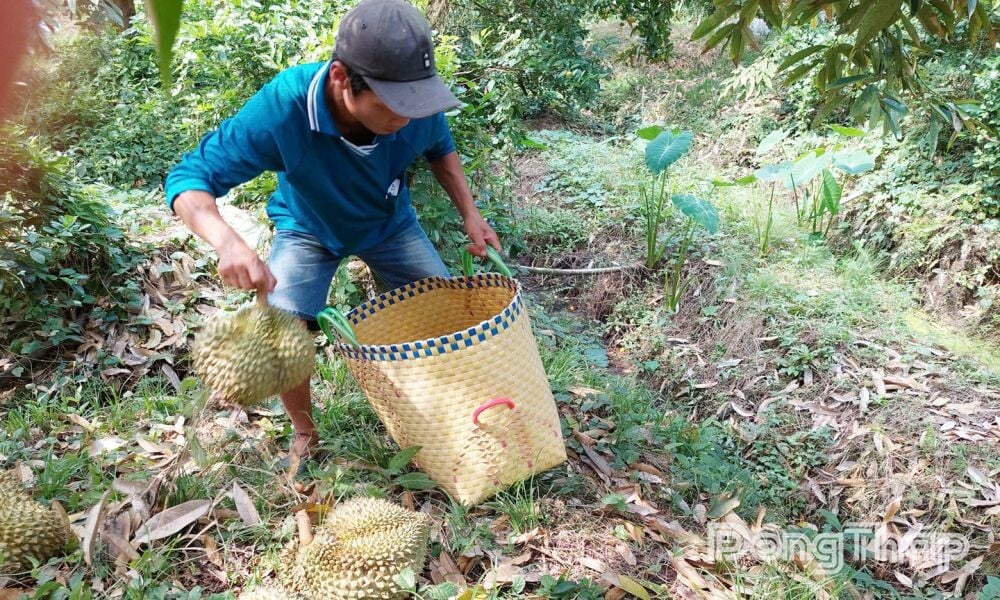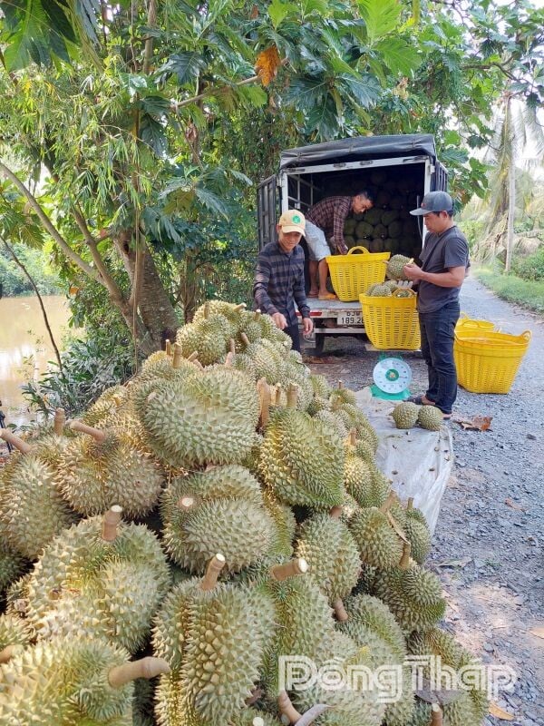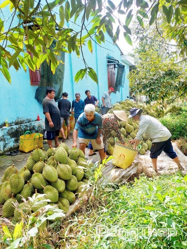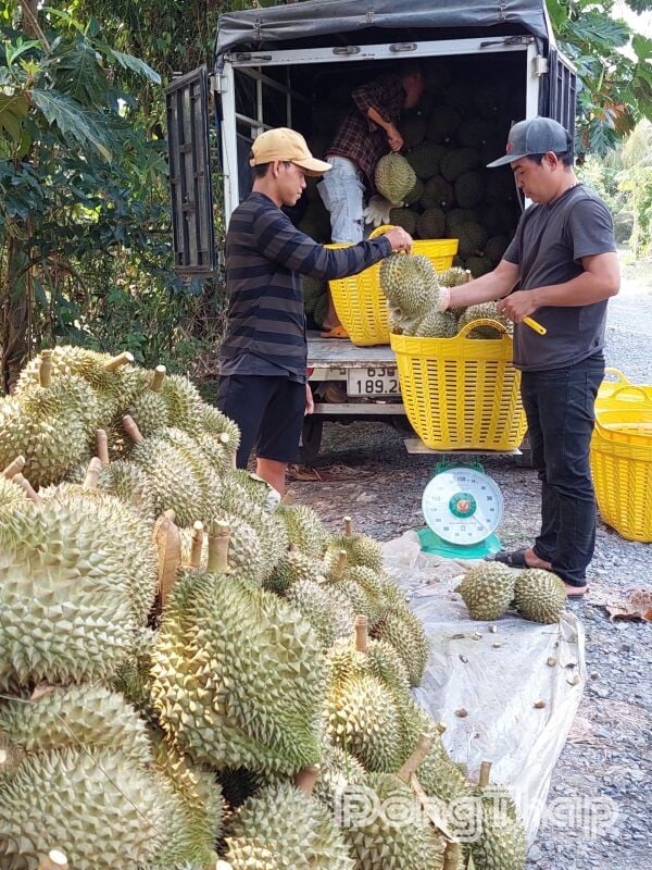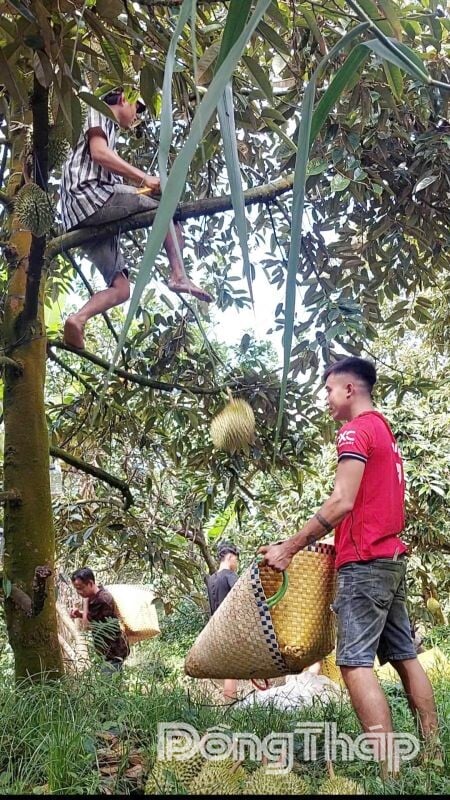 Durianplockarna skär den mogna frukten och släpper den till människorna nedanför. Durianen samlas in precis vid trädets bas innan de transporteras till en uppsamlingsplats för vägning av handlare. Samlar durian. Durianer transporteras till en uppsamlingsplats längs huvudvägen där handlare kommer för att väga och köpa dem. Trädgårdsmästarna samlar noggrant ihop varje durianfrukt. Trädgårdsmästarna samlar noggrant varje durianfrukt – belöningen för dagar av skötsel. Många fruktträdgårdsägare kom för att fira skördesäsongen, och utan att bli tillsagda hjälpte alla till för att samla och bära durianen. Handlarna kommer direkt till fruktträdgårdarna för att köpa durian. De tappar och sorterar varje durian innan de väger den och lastar den på lastbilar för distribution över hela landet och för export. Många durianhandlare sa: "Durianodlare i Dong Thap skördar under lågsäsong, säljer till bra priser och gör en hyfsad vinst."