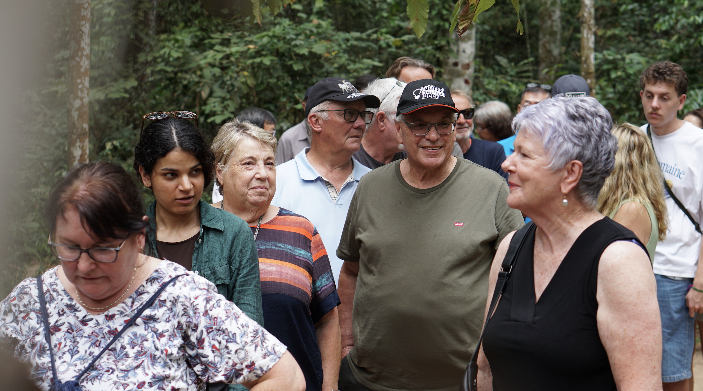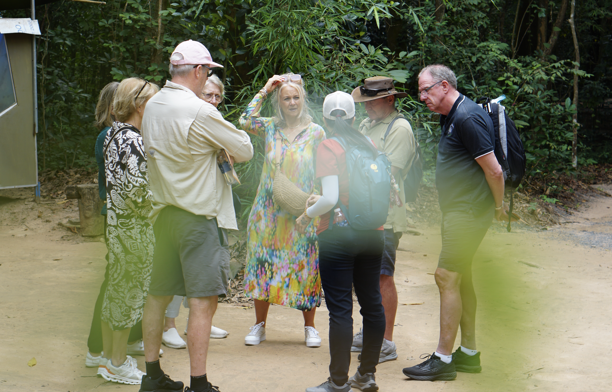 Inhemska och internationella turister lyssnar uppmärksamt på reseguider som berättar historier i Cu Chi-tunnlarna.