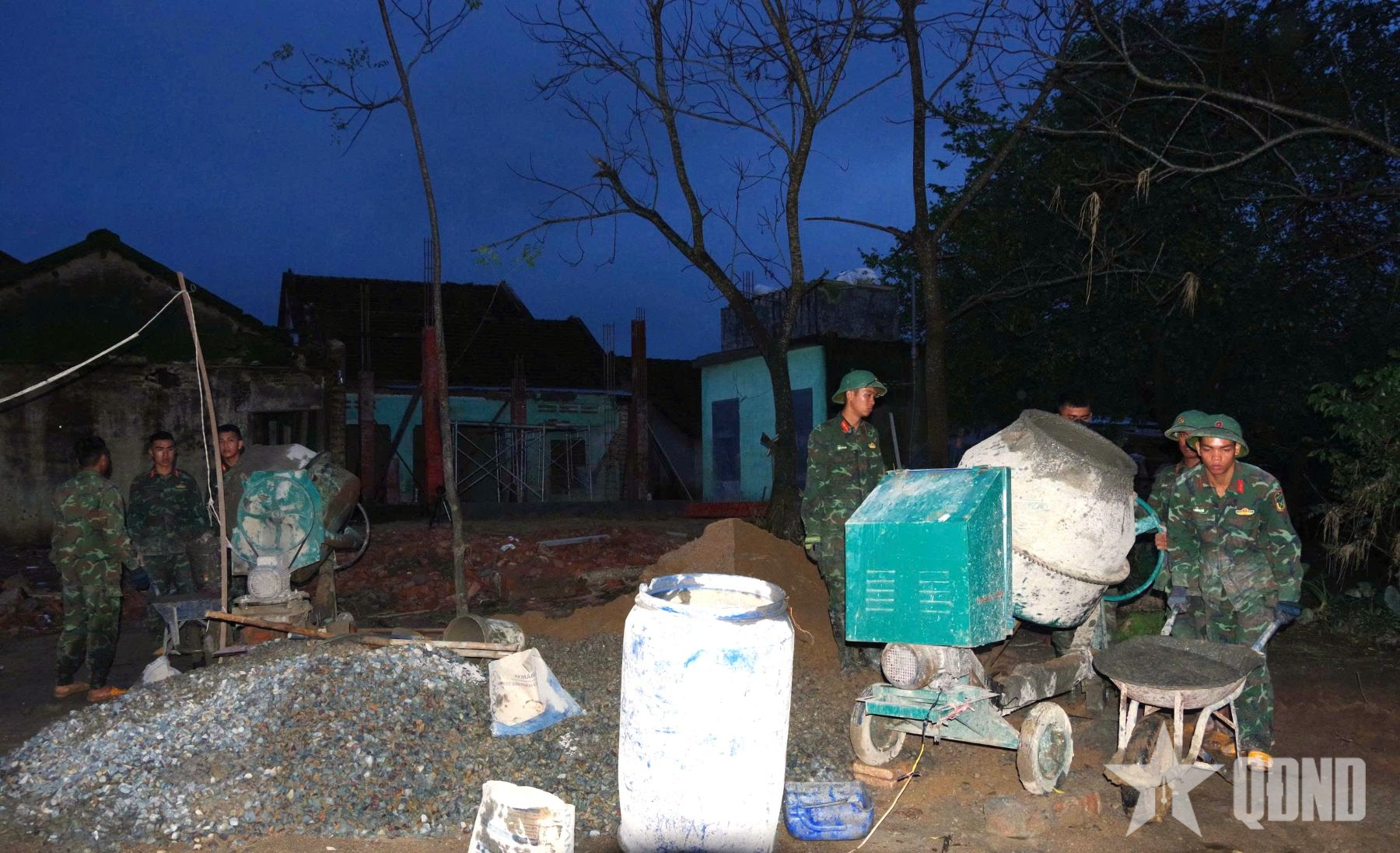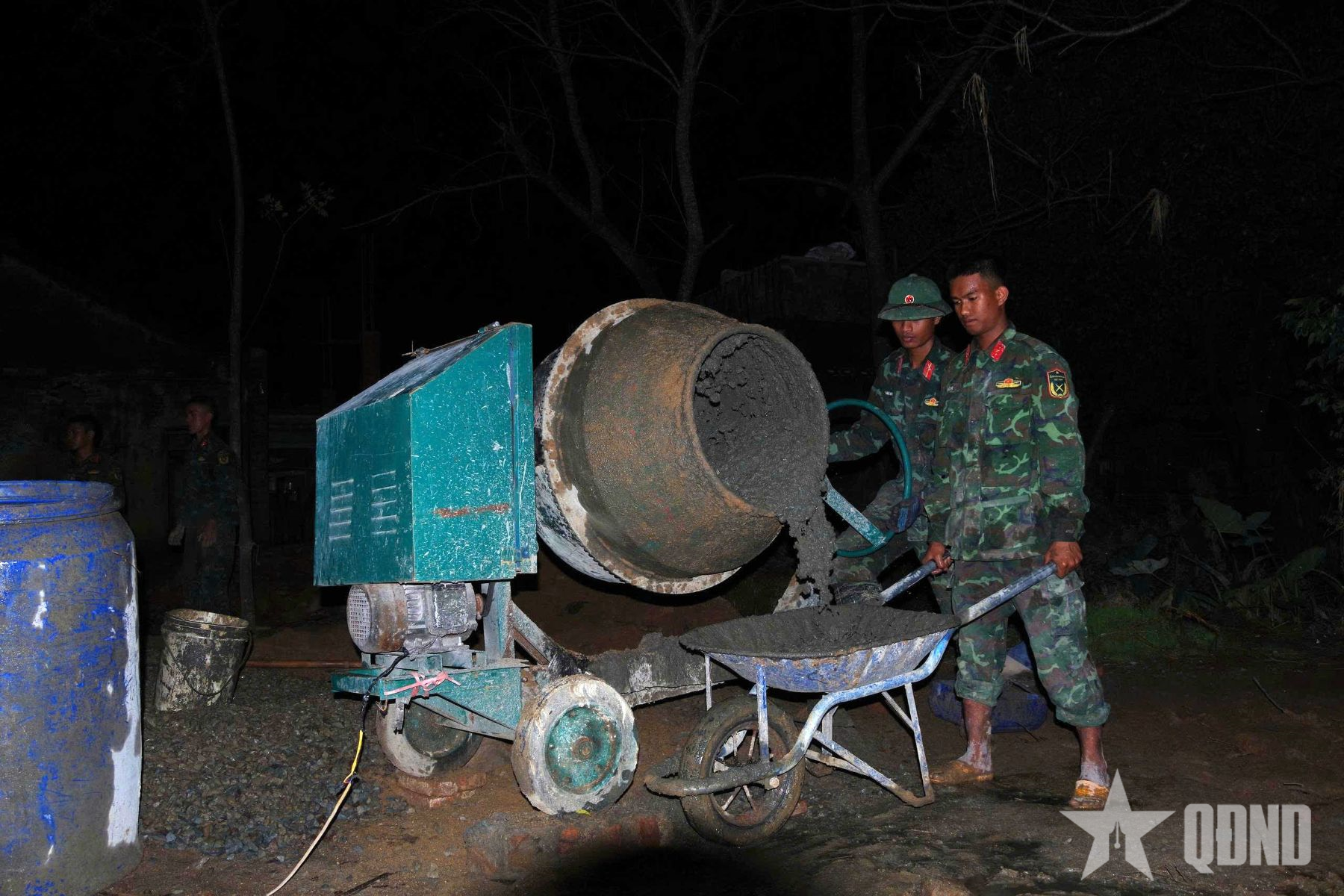 När vi anlände till byggarbetsplatserna observerade vi en mycket brådskande och livlig arbetsatmosfär. Varje team bestod av 15 till 20 arbetare. Några blandade betong och armeringsstål, andra skottade sand, sten och grus... ljudet av betongblandare blandades med soldaternas skratt och prat, vilket skapade en livlig atmosfär i hela området. Nattetid övervakades byggprojekten noggrant, med tekniska officerare stationerade vid varje arbetsplats. Alla officerare och soldater var fast beslutna att påskynda framstegen, men byggkvaliteten måste vara säker, hållbar och i enlighet med designen.
