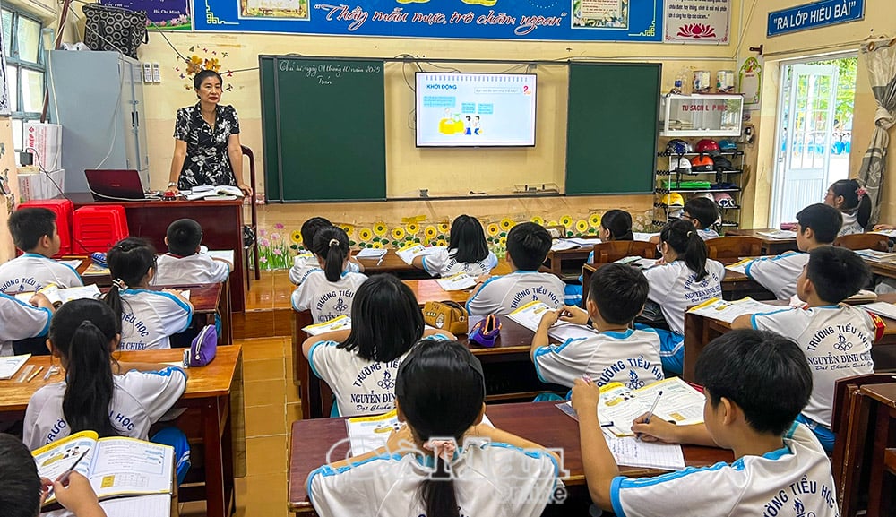 Lärare på Nguyen Dinh Chieu Primary School använder informationsteknik i undervisningen. (Foto: Chi Linh)