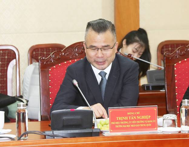 På arbetsdelegationens vägnar tackade kamrat Trinh Tan Nghiep, vice ordförande och ständig medlem av partikommittén vid Kinas folkuniversitet, respektfullt Vietnams kommunistiska partis centrala inspektionskommission för det varma välkomnandet; och presenterade historien om bildandet, utvecklingen och utbildningen av universitetets huvudämnen, inklusive Akademin för inspektion och övervakning. Kamrat Trinh Tan Nghiep hoppades på samarbete och kontakt mellan Vietnams kommunistiska partis centrala inspektionskommission, vietnamesiska universitet och Kinas folkuniversitet inom utbildning inom inspektion och övervakning under den kommande tiden.
