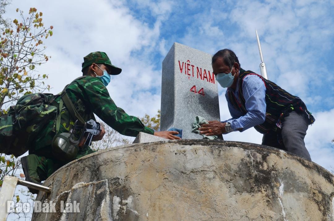 | Herr Y Mốk Hra, en ansedd person i byn Drang Phốk, städade tillsammans med gränsvakter och soldater landmärke 44. Foto: Nguyen Lan |