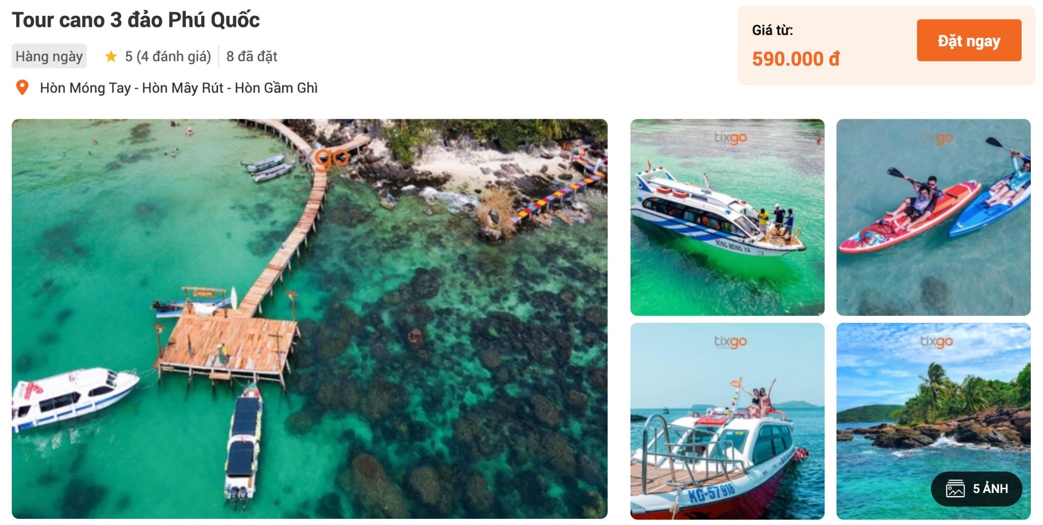 Kanotturen på Phu Quoc, som sträcker sig över tre öar, är en av Tixgos "bästsäljare". Resan tar besökarna till tre berömda öar: Hon Mong Tay - Hon Gam Ghi - Hon May Rut, och det är extremt intressant att få uppleva en höghastighetskanot. Höjdpunkter: