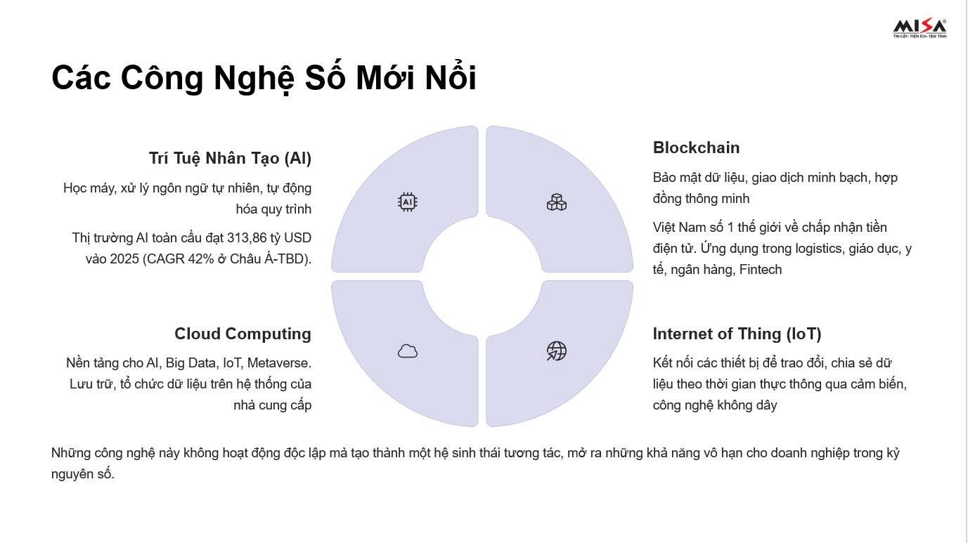 I ett tal vid konferensen betonade Nguyen Xuan Hoang att tekniker som artificiell intelligens (AI), blockkedjor, sakernas internet (IoT) och molntjänster håller på att bli viktiga drivkrafter för att omforma den globala ekonomin . ”Dessa tekniker existerar inte isolerat, utan är sammanlänkade till ett interaktivt teknikekosystem, vilket öppnar upp otaliga banbrytande utvecklingsmöjligheter för vietnamesiska företag”, delade Hoang.