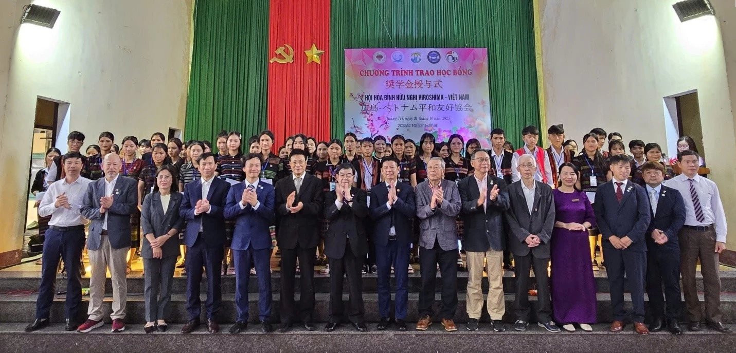 Vid detta tillfälle delade delegationen ut 60 årliga stipendier till missgynnade elever vid Nam Quang Tri internatskola för etniska minoriteter. Herr Akagi Tatsuo bekräftade att föreningen kommer att fortsätta att vara en bro för att stärka samarbetet mellan Hiroshima och Quang Tri.