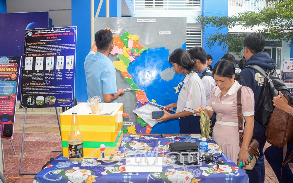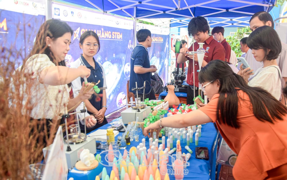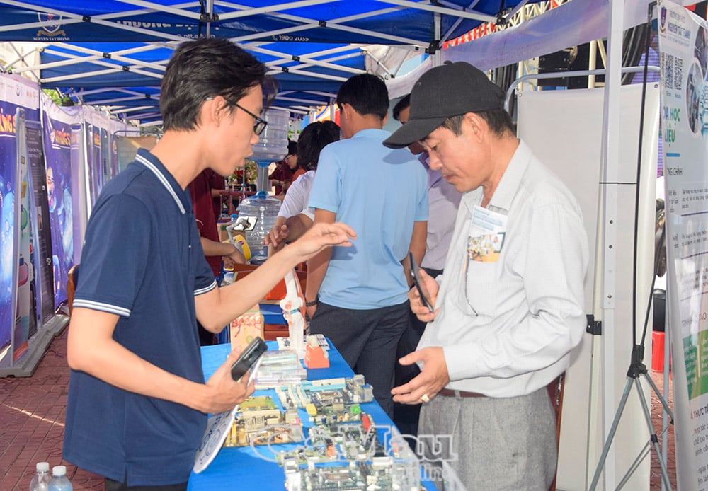 Redan från första minuten blev festivalområdet fullt av ett system av montrar som visade upp vetenskapliga modeller och smarta enheter designade och tillverkade av studenterna själva. Förutom 30 montrar från Nguyen Tat Thanh-universitetet deltog även chefer, lärare och elever från alla gymnasieskolor i provinsen, varav 17 skolor registrerade sig för att presentera sina STEM-produkter.
