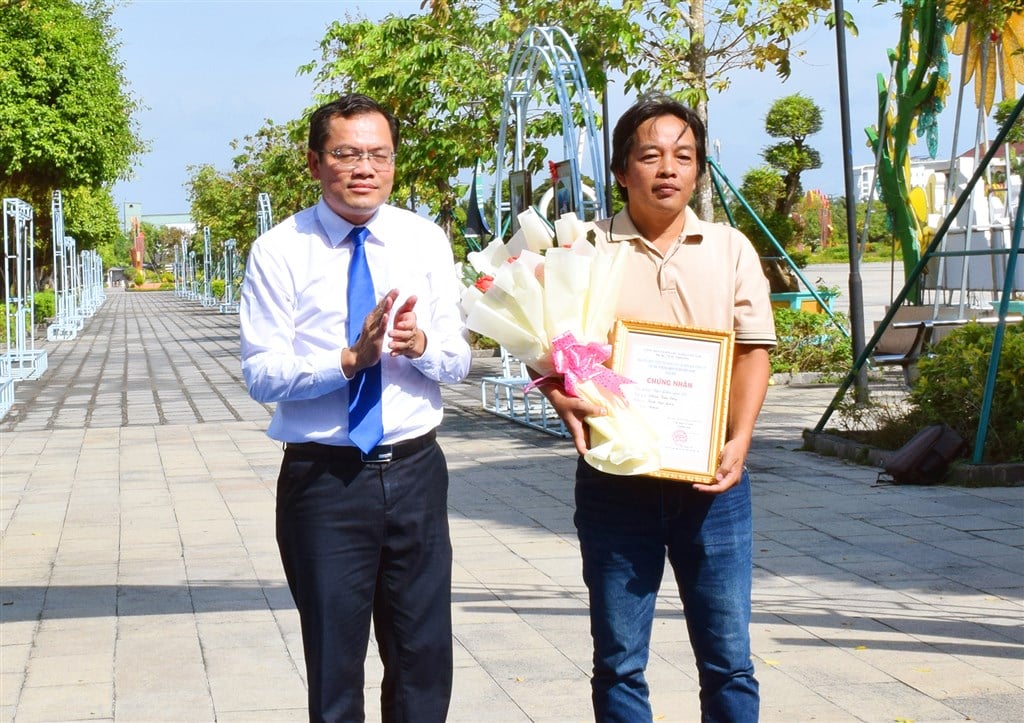 Vice ordförande för provinsens folkkommitté, Ngo Vu Thang, delade ut första priset i skrivtävlingen till minne av 85-årsdagen av partikommitténs, arméns och folkets revolutionära tradition i Ca Mau-provinsen till kamrat Nguyen Truong Minh, ungdomsförbundet vid Hon Khoai gränsbevakningsstation.