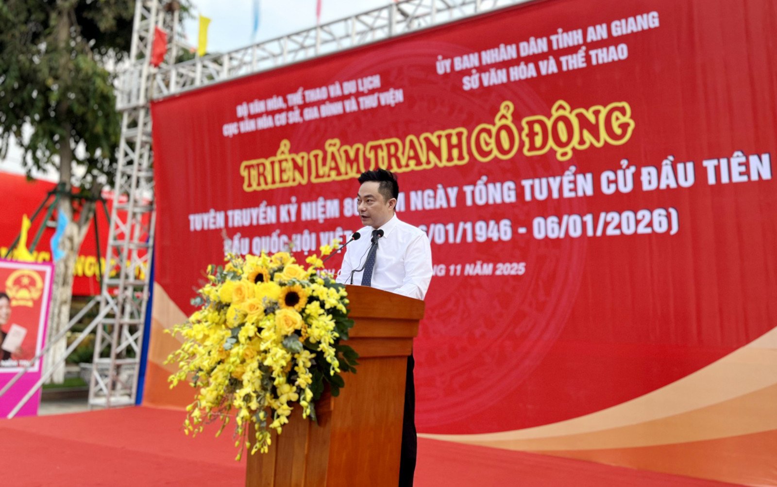 Biträdande direktör för avdelningen för gräsrotskultur, familj och bibliotek, Nguyen Quoc Huy, höll utställningens öppningstal.