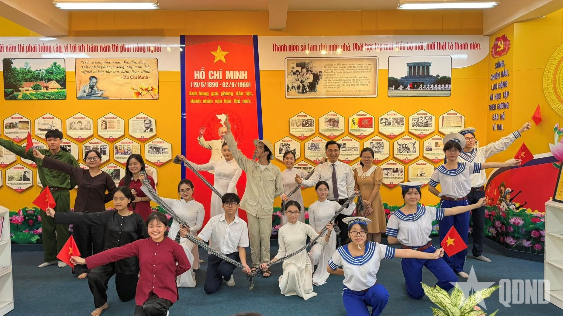 Samtidigt undervisades många historieämnen av lärare direkt i Ho Chi Minhs kulturella rum, vilket skapade en fräsch och högtidlig atmosfär och främjade en känsla av respekt för historia bland eleverna. Med temat "Motståndskriget mot USA, för nationell räddning (1954-1975) och president Ho Chi Minhs roll" organiserade historieläraren Le Thi Nu en presentation av läroämnena från klass 12A7. Lektionen började med sången "Landets fullständiga glädje", följt av presentationer från grupper genom projektioner, pjäser och teaterföreställningar. Kreativiteten hos både lärare och elever gjorde lärorummet mer levande och känslomässigt rikt.