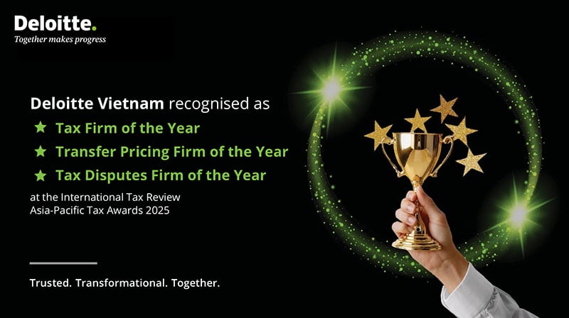 År 2025 bekräftade Deloitte Vietnam återigen sin ledande position när de tilldelades tre prestigefyllda utmärkelser av International Tax Review (ITR): ”Tax Firm of the Year” (femte året i rad), ”Transfer Pricing Firm of the Year” och ”Controversy Firm of the Year” på den vietnamesiska marknaden.