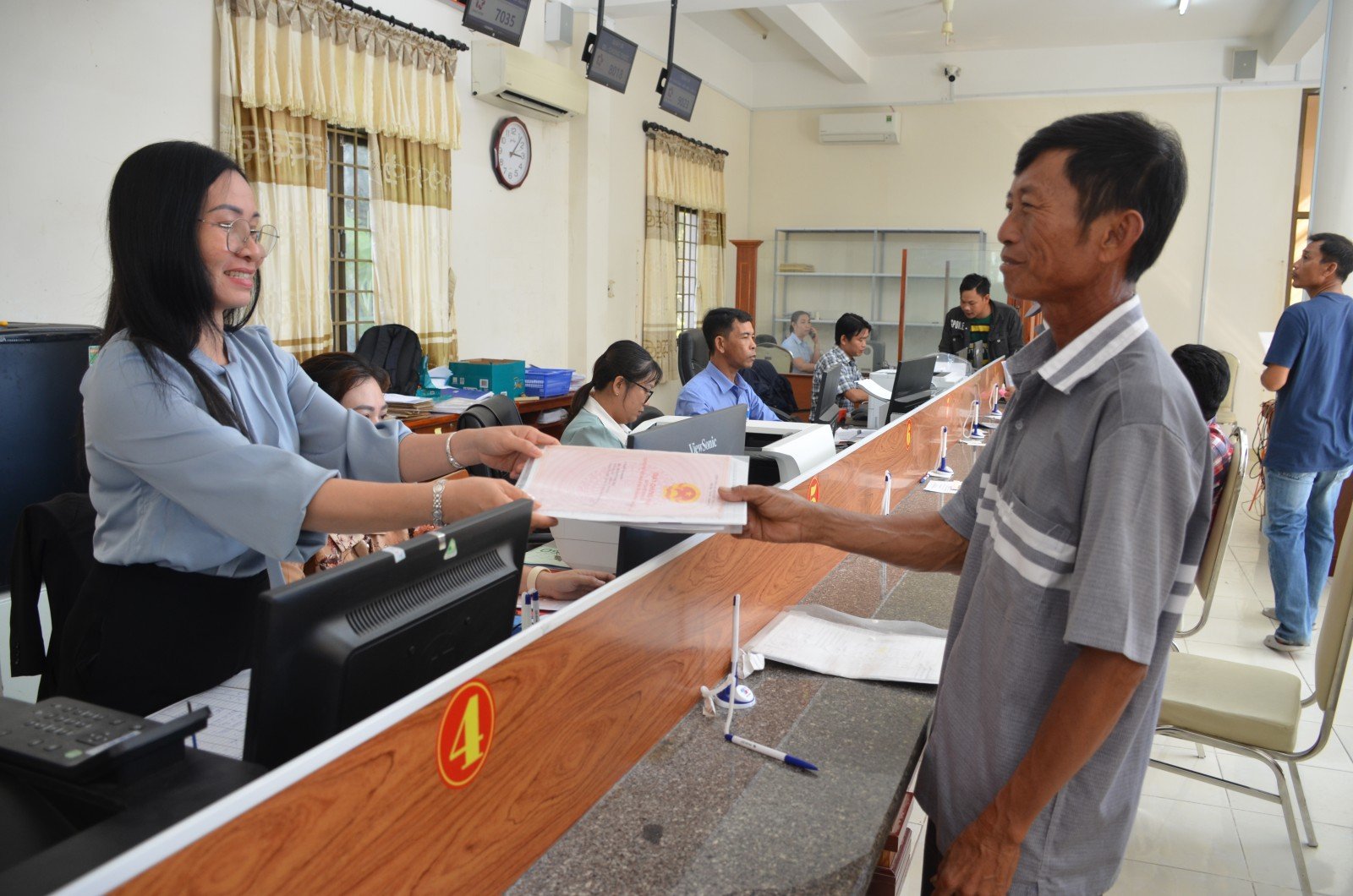 Tjänstemän vid Kien Luong kommuns administrativa servicecenter återlämnar resultaten av administrativa förfaranden till medborgarna.