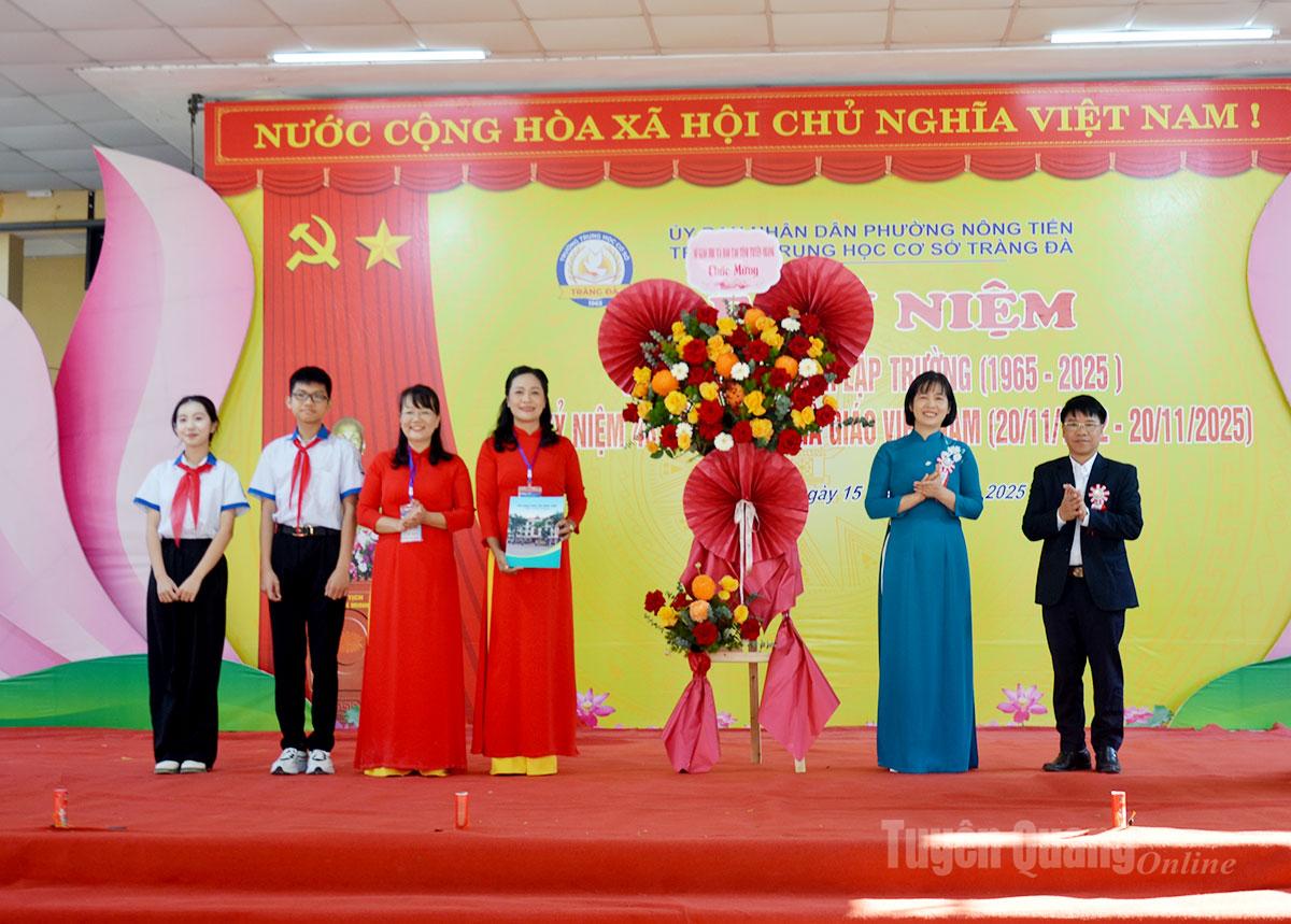 | Representanter för provinsens utbildningsdepartement överlämnade blommor för att gratulera lärare och elever vid Trang Da Secondary School med anledning av dess 60-årsjubileum. |