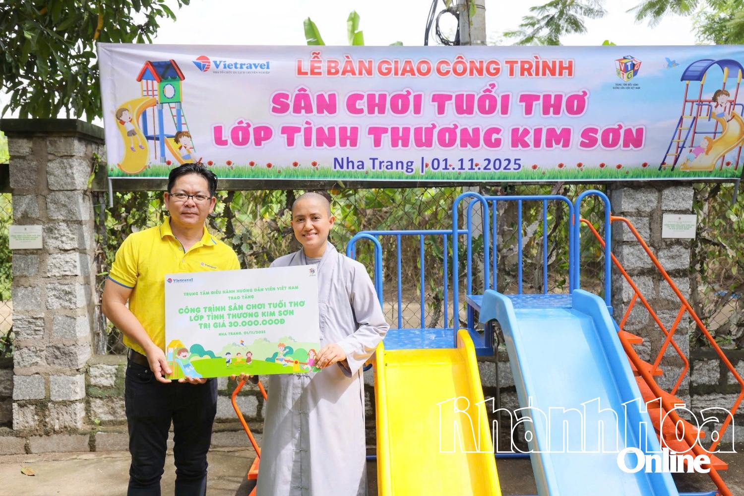 Under programmet delade delegationen ut 40 "Green Dream"-stipendier värda 60 miljoner VND och en lekplats (rutschkana, gunga, gungbräda) värd 30 miljoner VND till välgörenhetsklassen vid Kim Son-pagoden, vilket skapade en säker och hälsosam lekplats för barnen. Utöver gåvorna organiserade delegationen en fest och folklekar, vilket gav eleverna skratt och en genuin barndomsupplevelse.