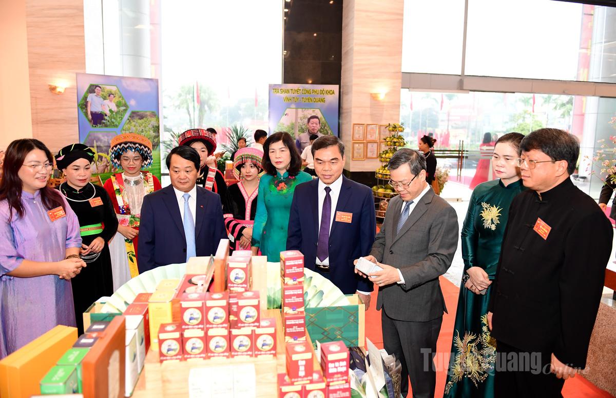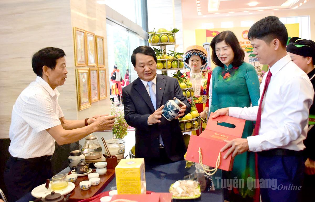 | Kamrat Hau A Lenh, medlem av partiets centralkommitté och sekreterare för Tuyen Quangs provinsiella partikommitté, besökte teprodukter i montern som visade upp typiska produkter från provinsen. |