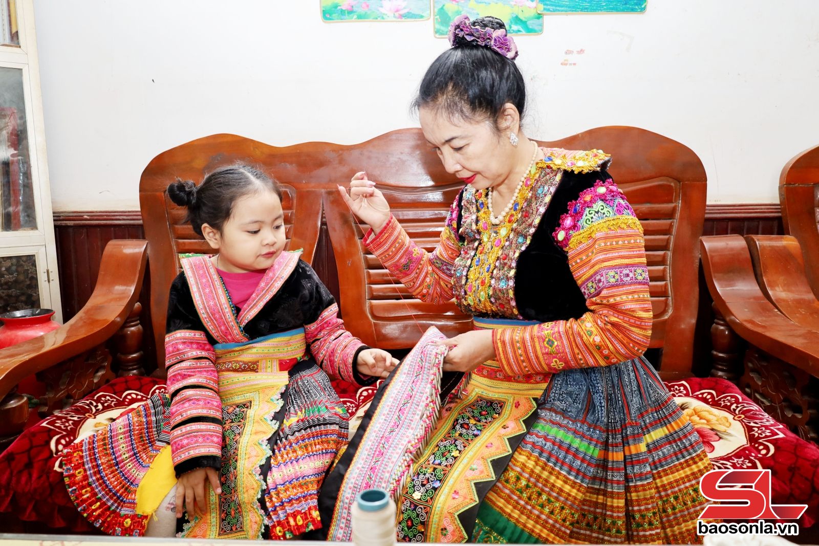Fru Mai anförtrodde: Även om jag bor i staden och inte längre arbetar på fälten, kommer jag alltid ihåg att jag måste bevara mina förfäders broderi- och bivaxmålningsyrke. Att bevara yrket innebär att bevara mitt folks rötter. Jag lärde mina barnbarn yrket sedan de var unga; detta är deras morföräldrars och förfäders dräkt, så att de kan vara stolta. Varje helgdag eller nyår bär hela familjen Mong-dräkter tillsammans. Att se mina barnbarn bära dessa färgglada klänningar är min lycka.