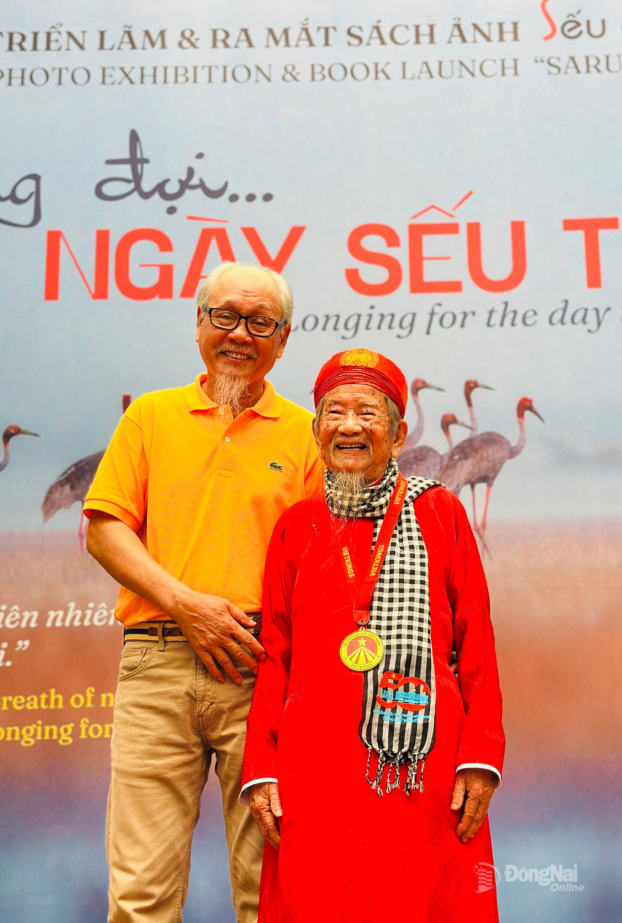 | Herr Nguyen Truong Sinh (vänster) och forskaren Nguyen Dinh Tu vid fotoutställningen Väntar på... Dagen då tranorna återvänder (22 oktober). |