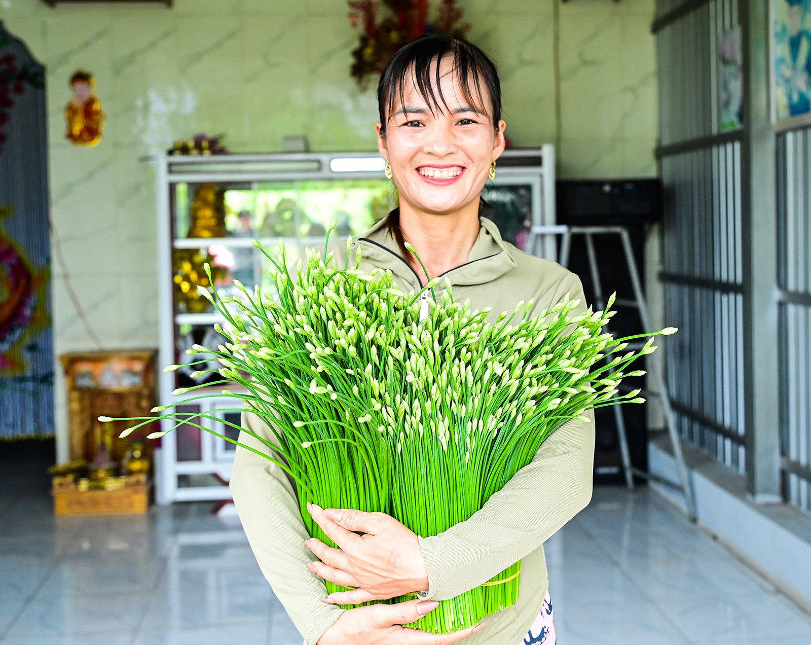 Fru Le Thi Dung, bosatt i kommunen U Minh Thuong, startade framgångsrikt ett företag med gräslök som modell. Foto: THUY TIEN