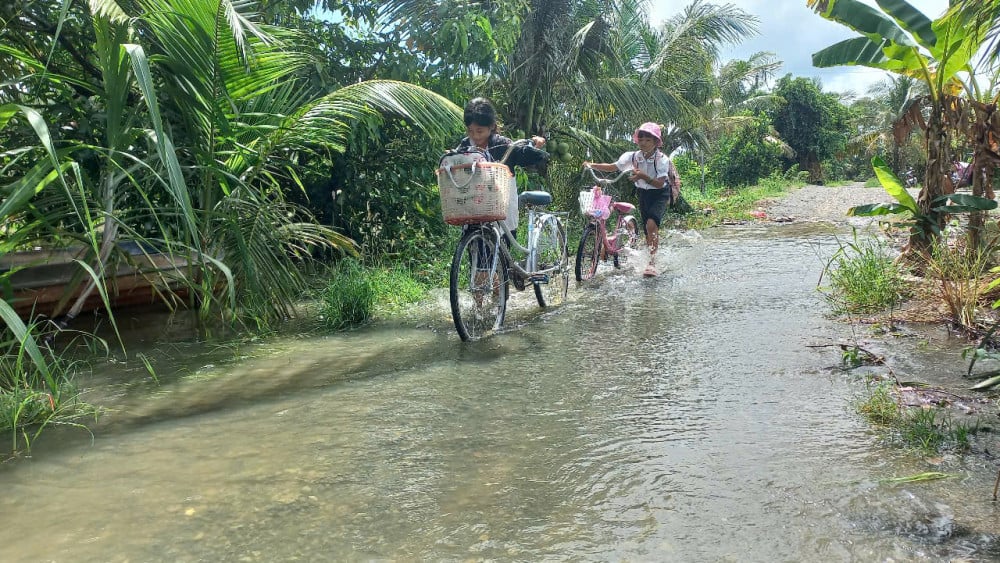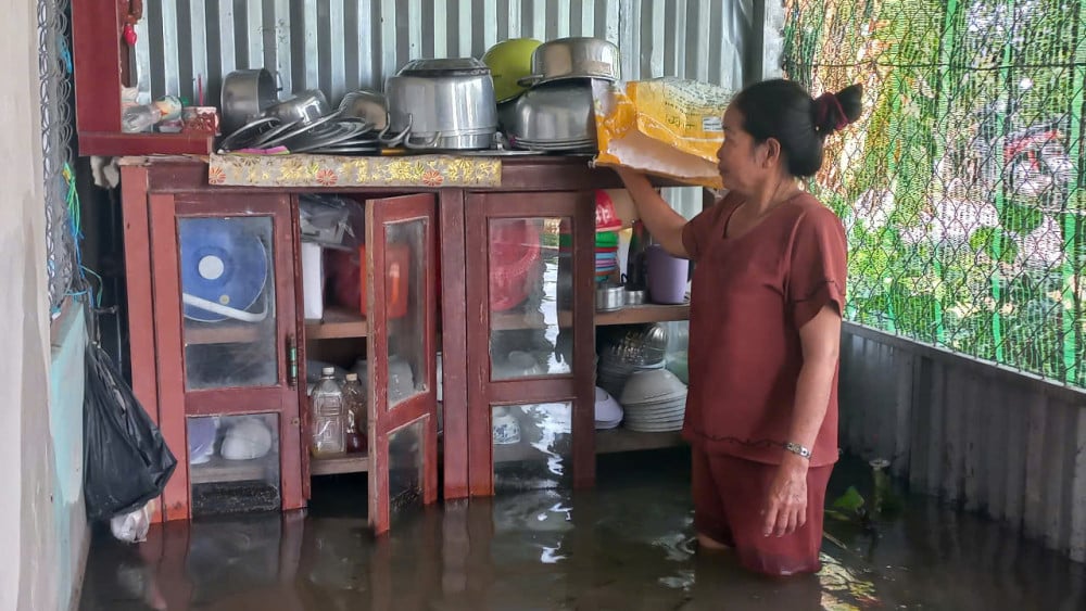 För att proaktivt förhindra att vatten strömmade in i hennes hus var Ms. Do Thi Be Hai (bosatt i byn Lang Sen i kommunen Vinh Chau) tvungen att köpa material och anställa arbetare för att bygga tegelstenar för att täppa till vattnet. Hon använde en motor för att pumpa ut vattnet, och när batteriet tog slut var hon tvungen att vänta i timmar på att tömma ut vattnet.