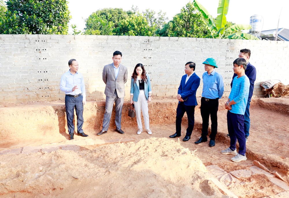 Därefter inspekterade kamrat Mai Son den arkeologiska platsen Hoanh Mo-pagoden i byn Hoanh Son (Lang Giang kommun). År 2024 samlade den specialiserade enheten in nästan 1 300 reliker från den 200 m² stora utgrävningsgropen, inklusive tegelstenar, kakel, glaserad keramik, porslin, statyer..., från Tran- till Nguyen-dynastierna. I enlighet med ledningen från departementet för kultur, sport och turism samordnade provinsmuseet med arkeologiska institutet för att fortsätta utöka utgrävningarna. I detta område upptäcktes många grundreliker och arkitektoniska gårdar från Tran-, Le Trung Hung- och Nguyen-dynastierna.