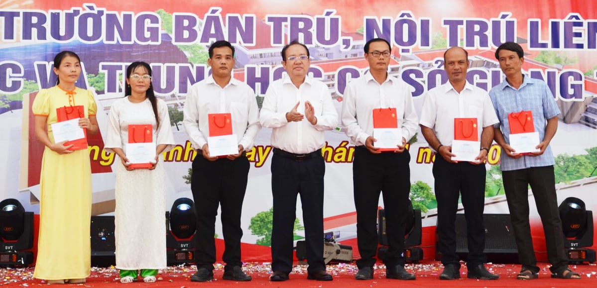 Biträdande utbildningsminister Nguyen Van Phuc och suppleant i partiets centralkommitté, biträdande sekreterare i den provinsiella partikommittén och ordförande för folkkommittén i An Giang-provinsen, Ho Van Mung, överlämnade gåvor till lärarna.