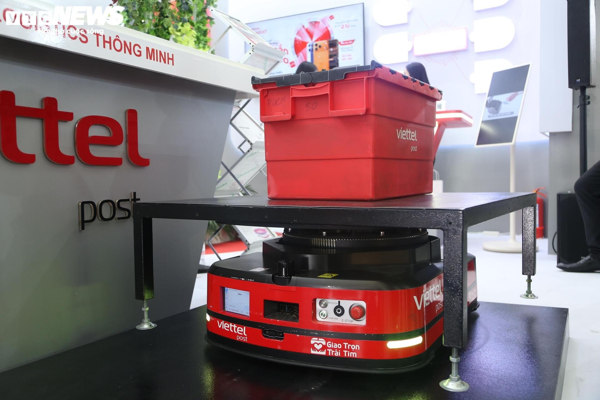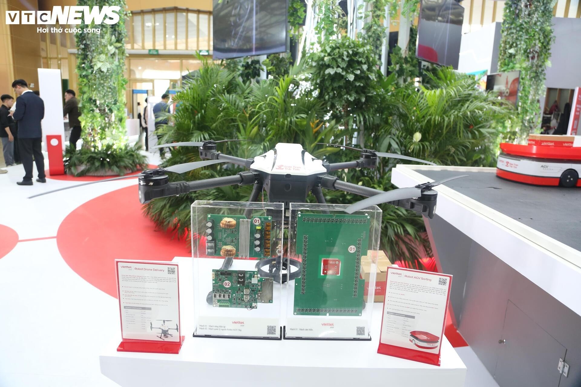Viettels monter visar produkter som drönarrobotar för transport av varor, AGV-sorteringsrobotar och AGV-plockrobotar som används i lager och på gårdar, vilka är undersökta, utvecklade och fullständigt behärskade av Viettel Posts ingenjörer.