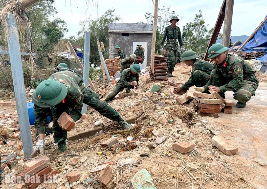 Den senaste översvämningen orsakade att väggarna i Mr. Luong Van Nghias hus (byn Phu Phong) slets av, tegeltaket rasade och många tillhörigheter sveptes bort. Officerare och soldater från Regiment 888, den provinsiella militära ledningen, arbetar tillsammans med familjen för att snarast återuppbygga taket, förstärka farliga platser och städa upp hela bostadsområdet.