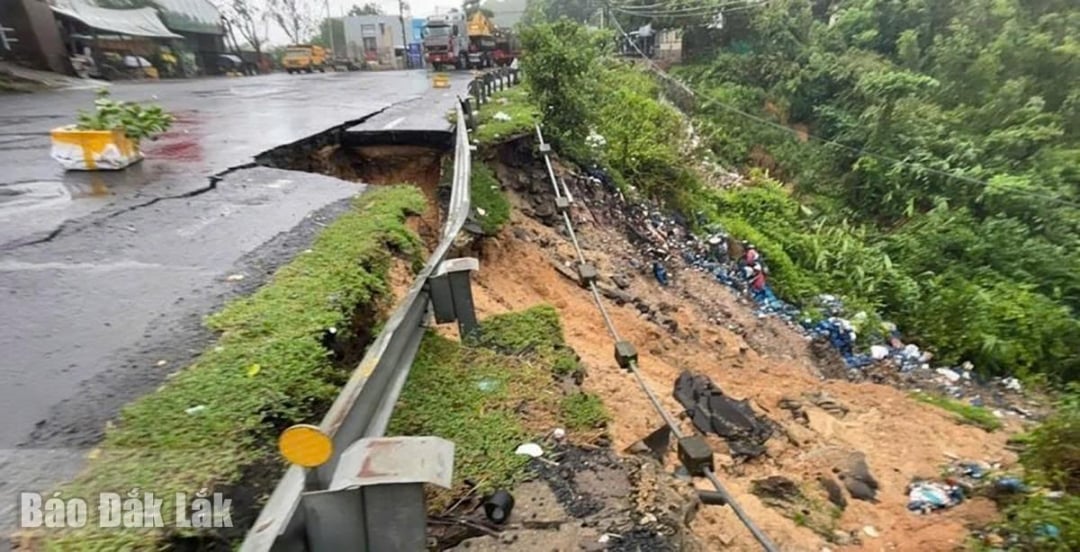 | Kraftiga regn och översvämningar orsakade allvarliga jordskred på riksväg 1 genom Hoa Xuan kommun. Foto: Hoang Tuyet |