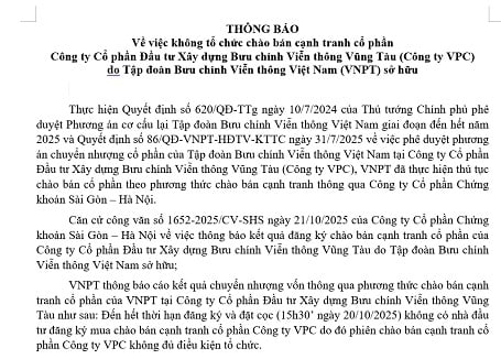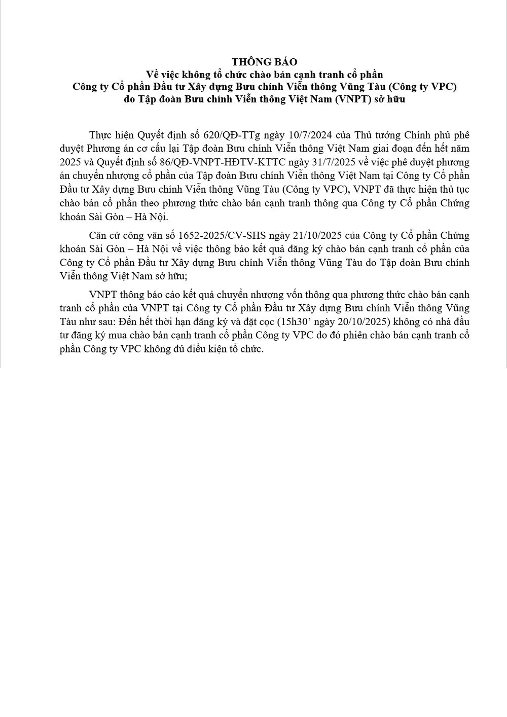 Vietnam Posts and Telecommunications Group (VNPT) vill meddela att de inte kommer att organisera ett konkurrensutsatt erbjudande av aktier i Vung Tau Posts and Telecommunications Construction Investment Joint Stock Company (VPC Company) som ägs av VNPT.