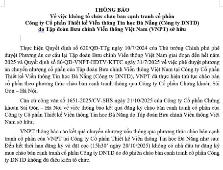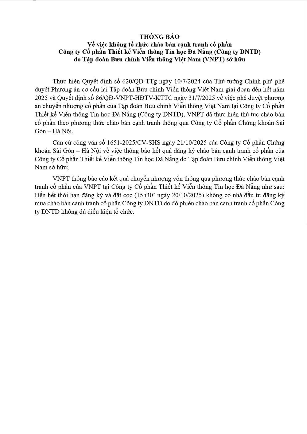 Vietnam Posts and Telecommunications Group (VNPT) vill meddela att de inte kommer att anordna någon auktion av aktier i Danang Information Technology and Telecommunication Design Joint Stock Company (DNTD Company) som ägs av VNPT.