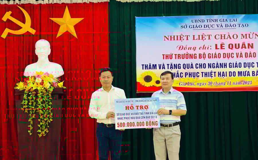 Vid detta tillfälle överlämnade biträdande utbildningsminister Le Quan, på uppdrag av utbildningsministeriet, 500 miljoner VND i stöd till utbildningsdepartementet i Gia Lai-provinsen för att återvinna skador orsakade av stormar och översvämningar.
