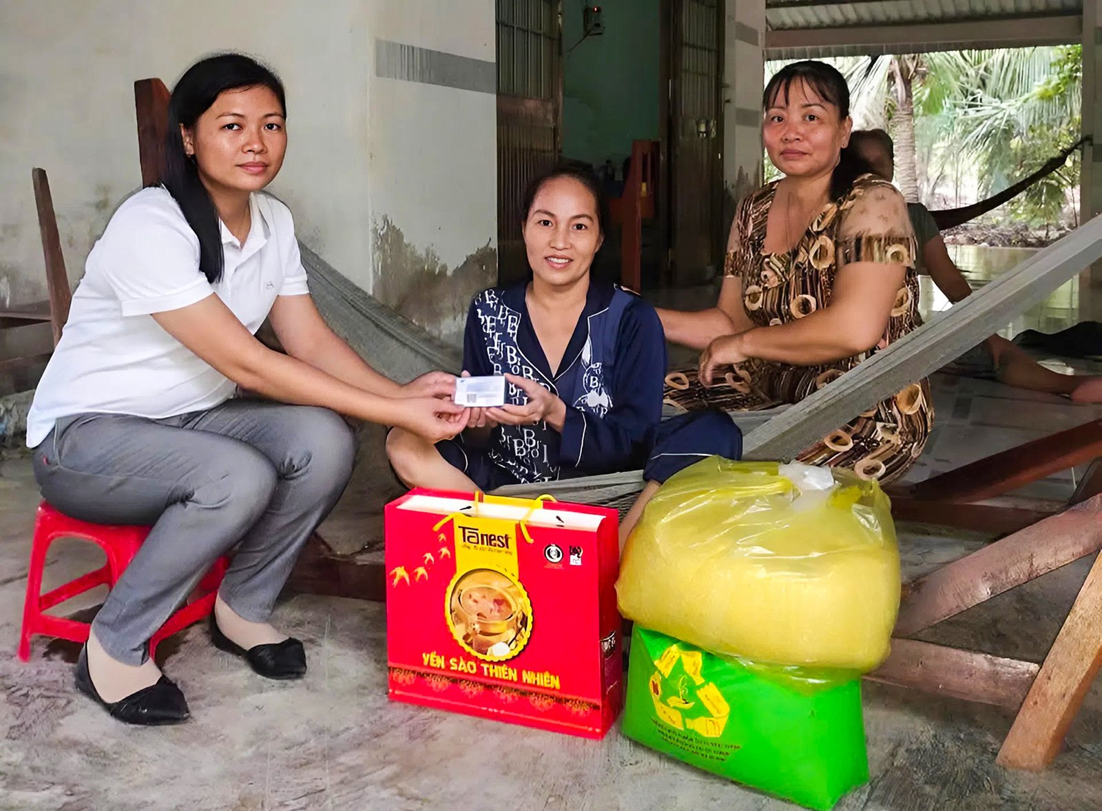 Kvinnor i Vinh Hoa-kommunen ger gåvor och sjukförsäkringskort till kvinnliga medlemmar i svåra omständigheter. Foto: THUY TIEN
