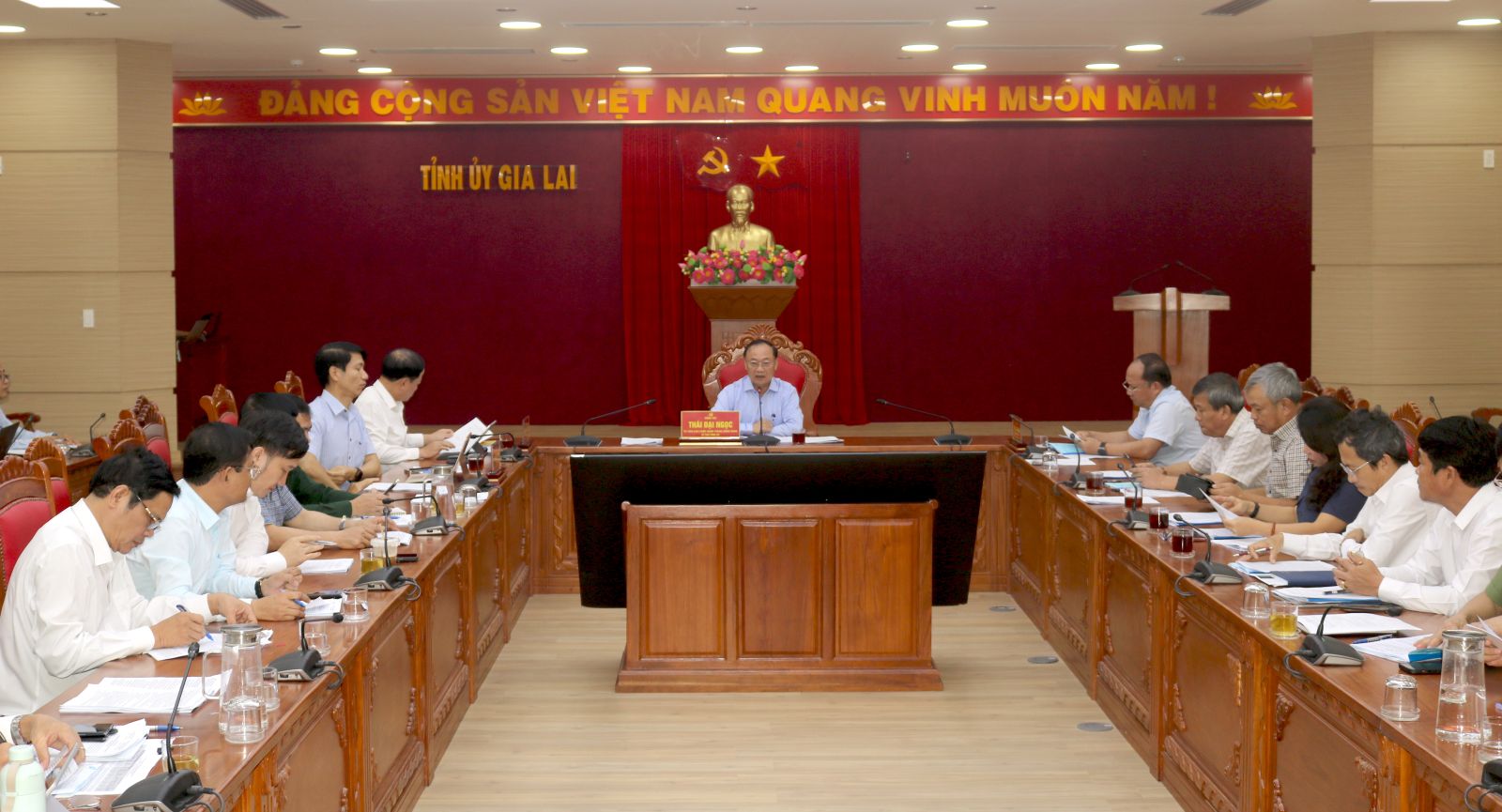 (gialai.gov.vn) - Sáng 04/11, tại trụ sở Tỉnh ủy, Bí thư Tỉnh ủy Thái Đại Ngọc - Trưởng ban Ban Chỉ đạo các công trình trọng điểm Quốc gia, tỉnh Gia Lai chủ trì phiên họp thứ 3 của Ban Chỉ đạo. Phiên họp được tổ chức theo hình thức trực tiếp kết hợp trực tuyến đến các xã, phường có dự án đi qua. Dự phiên họp có các đồng chí: Rah Lan Chung - Phó Bí thư Thường trực Tỉnh ủy, Chủ tịch HĐND tỉnh; Phạm Anh Tuấn - Phó Bí thư Tỉnh ủy, Chủ tịch UBND tỉnh; Nguyễn Ngọc Lương - Phó Bí thư Tỉnh ủy, Chủ tịch Ủy ban MTTQ Việt Nam tỉnh; các thành viên Ban Chỉ đạo.